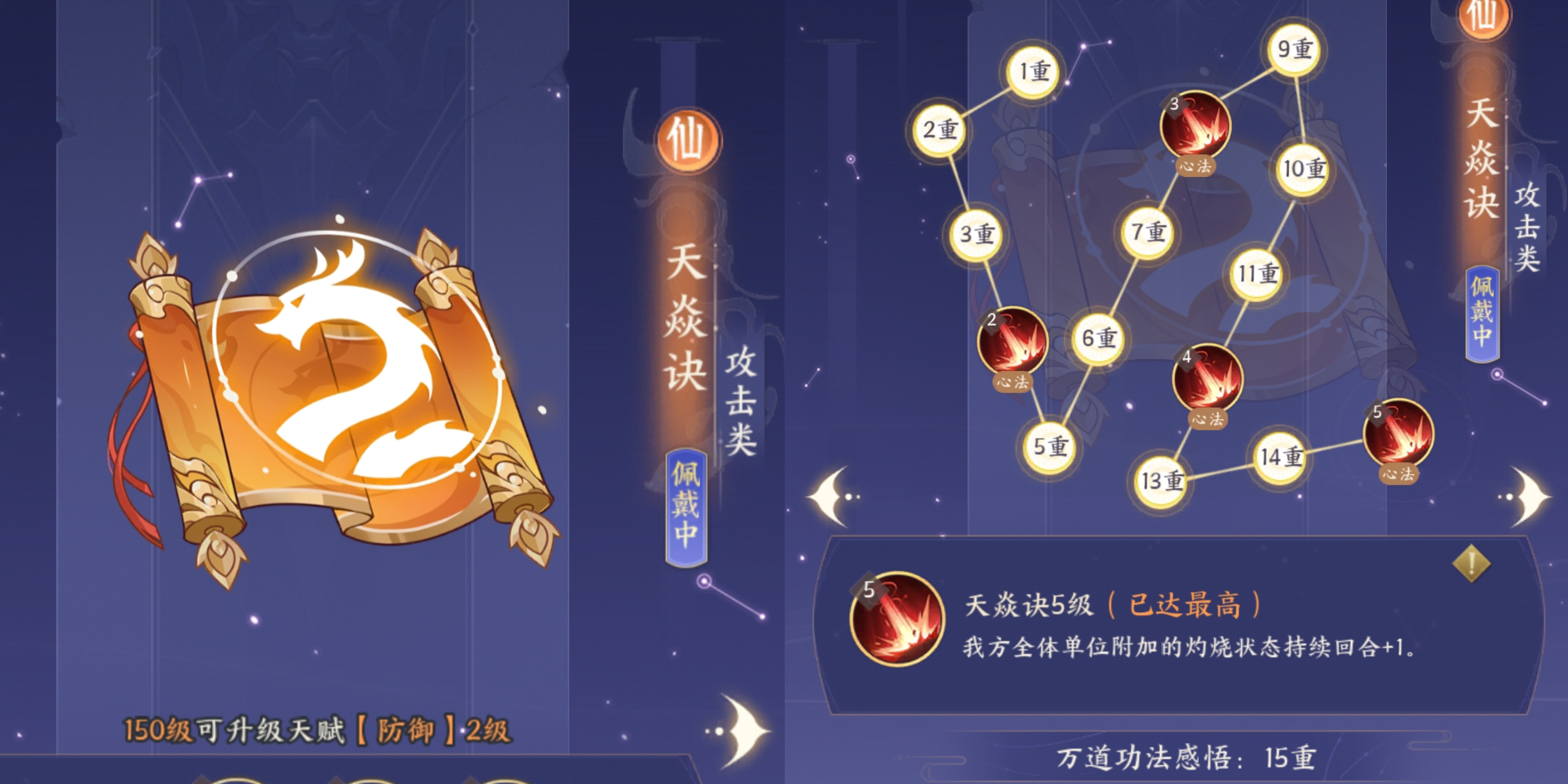 解析:天焱决朱雀的核心道法,也是目前必带的道法之一,不可或缺的道法。非常适合主c朱雀,朱雀挂灼烧状态后我方全体可以对敌方处于灼伤状态的敌人提高大量伤害,同时灼伤状态效果持续更久。