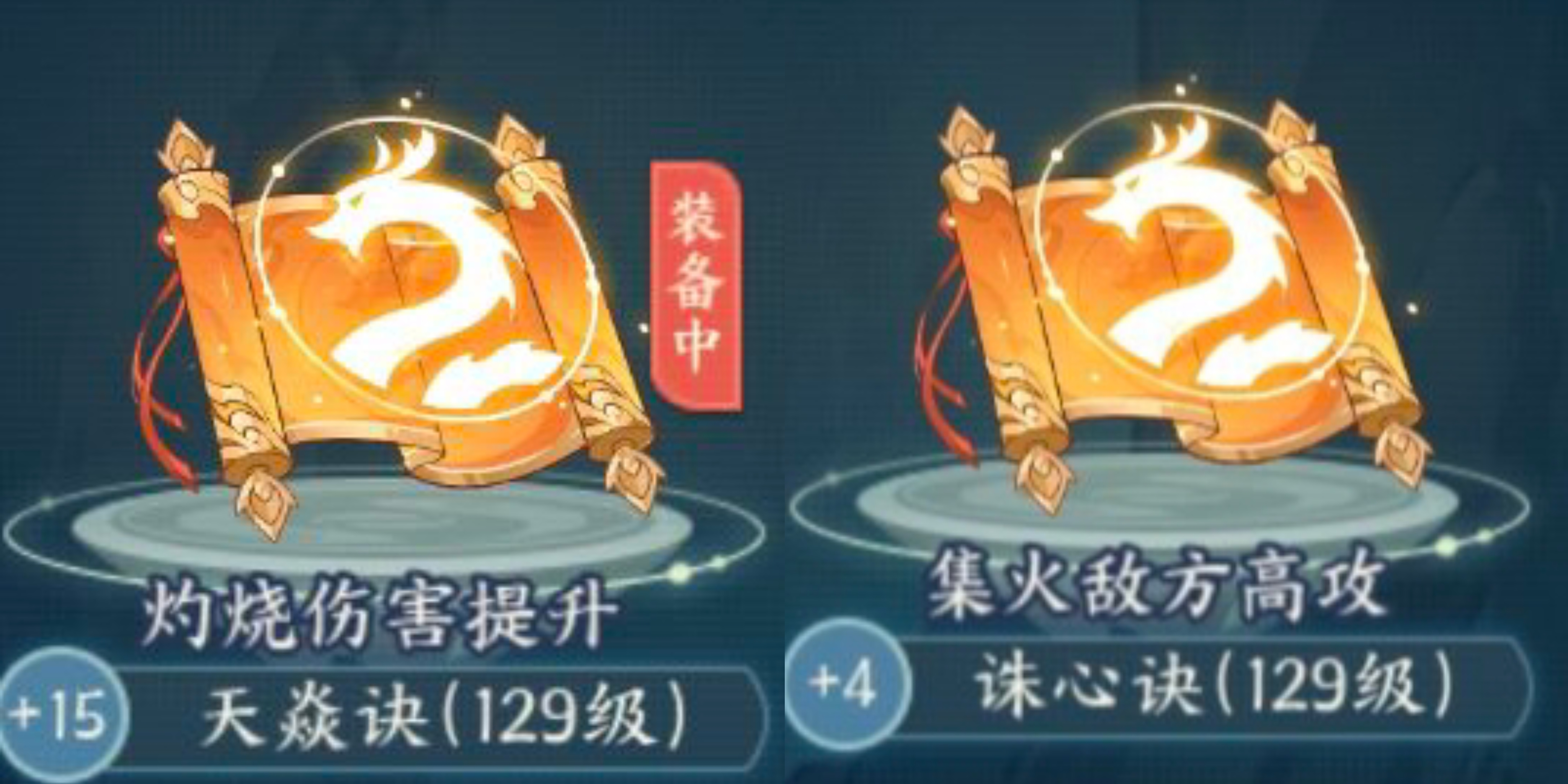 解析:在没有开启2层【大衍决】前,可以使用这套搭配,天焱决必带,主c朱雀的核心道法。诛心决可以优先针对敌方主c的伤害,同时还可以造成真实伤害。
