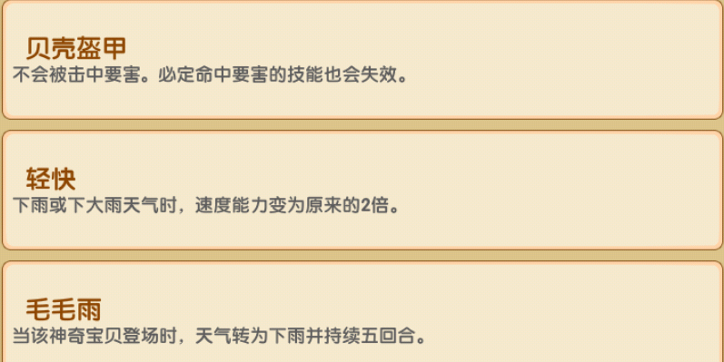 毛毛雨则是用来开天气,但是不推荐,还不如大嘴欧呢,要么就开沙流(特防*1.5倍辅助,或者福利队友)。