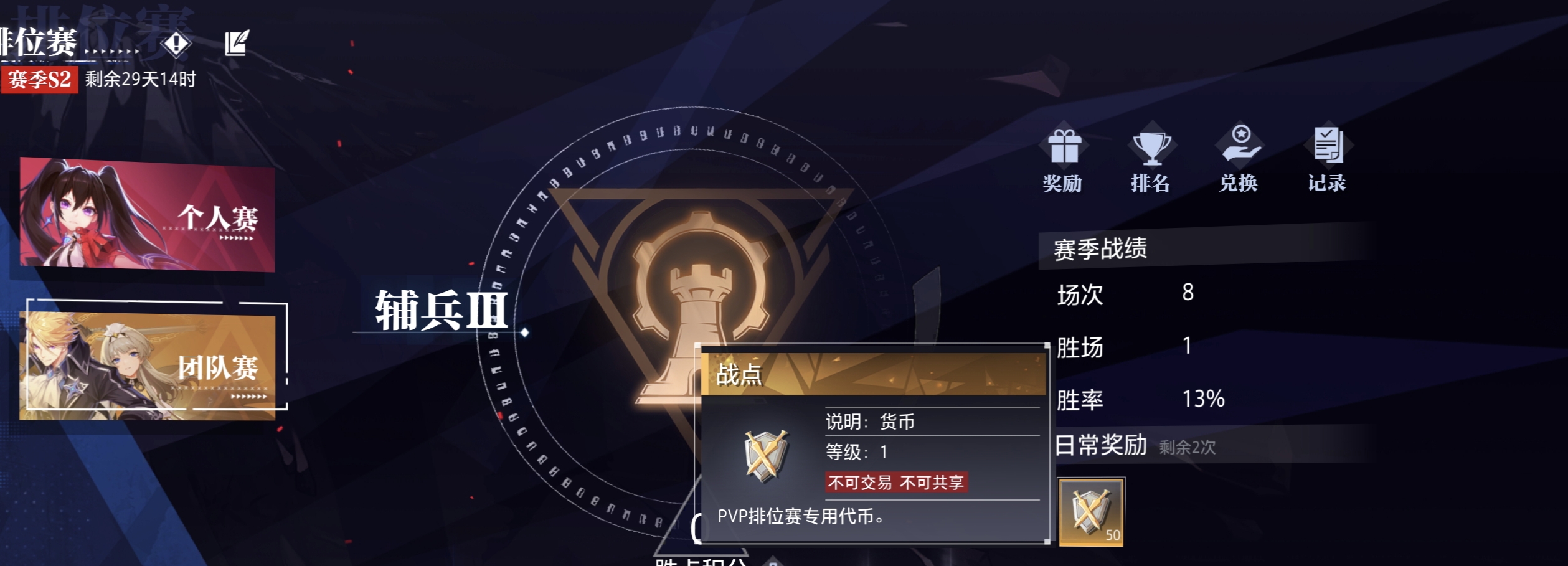 2次团队赛可以获得100点战点。