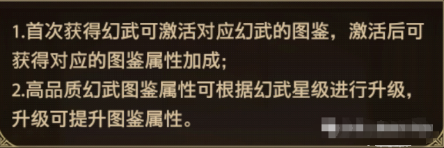 首次获得幻武可激活对应的幻武图鉴,激活后可获得对应的图鉴属性加成,品质越好的幻武,对应的图鉴加成也越好,红色品质的幻武可以通过提升幻武星级来提升对应的图鉴属性加成。