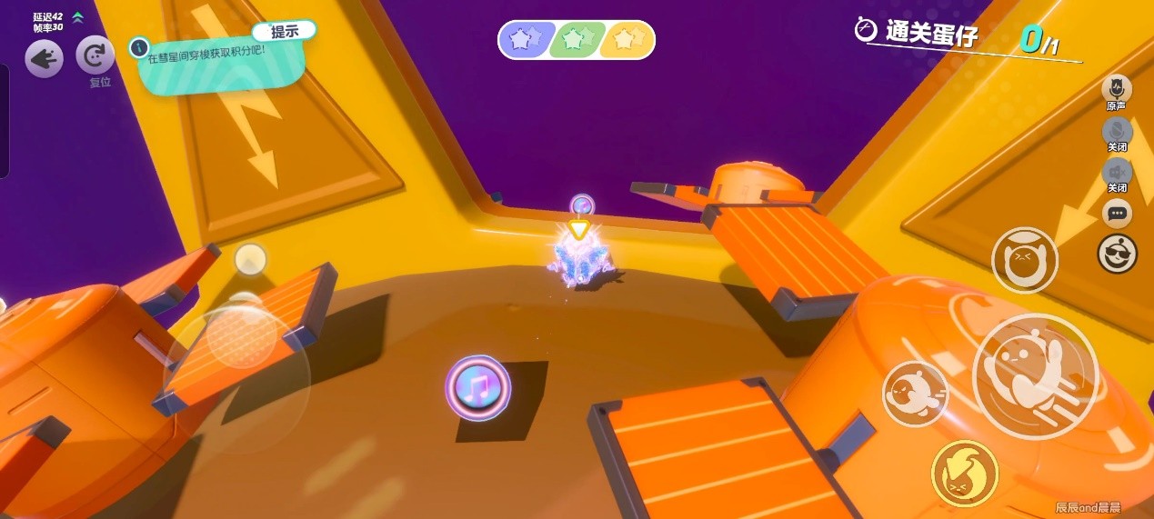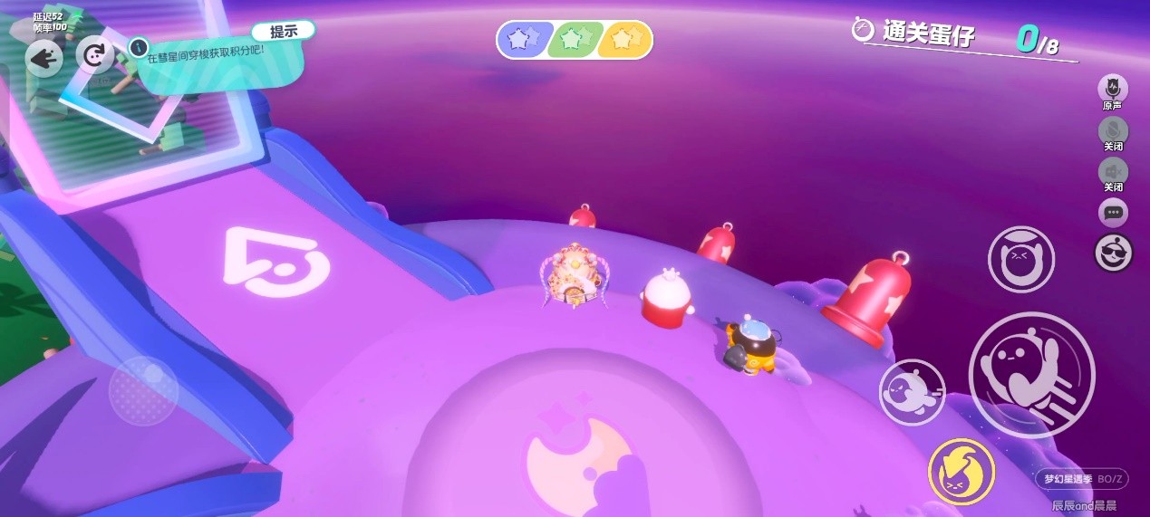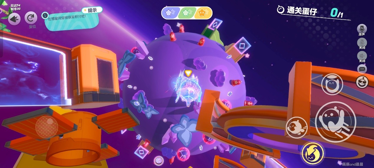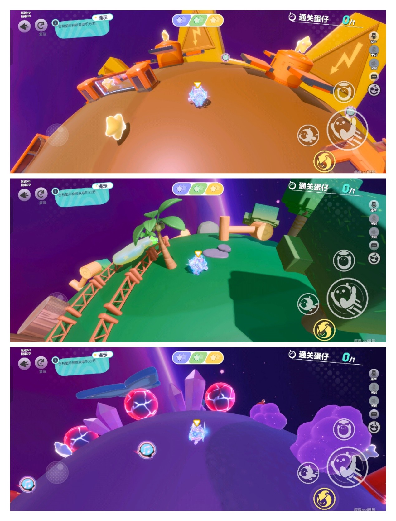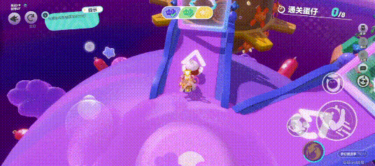 每个星球都有独特的地形和障碍,还会有对应颜色的积分豆。绿色星球上有很多树、灌木、树叶形的平台,紫色星球上有很多障碍和滚动的大球,黄色星球上有电网、阶梯、挡板,还有一个巨大的齿轮把星球分成两半,这也是我认为最难的一个星球。