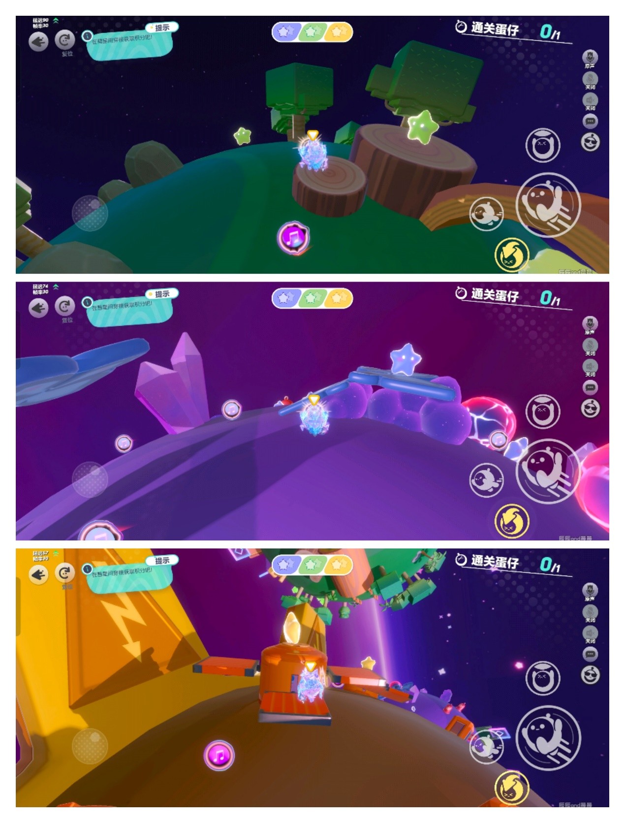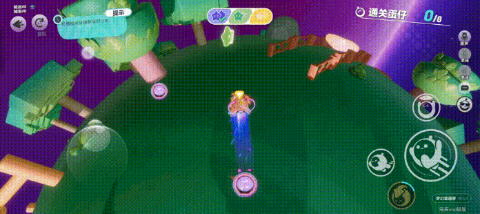 这个三个星球,分别是黄、绿、紫。这三个星球和大家印象里的星球一样,重力方向一直在变,始终垂直于地面,走起来会有一点眩晕感。