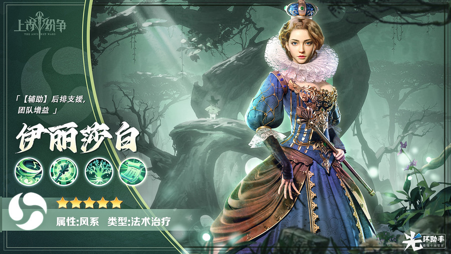 风之赞歌:为己方全体回复施法者攻击72%的生命,并为己方除自己外的全体单位附加[风灵之纹]2回合