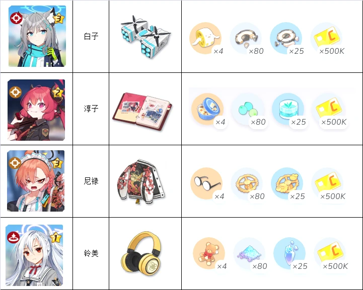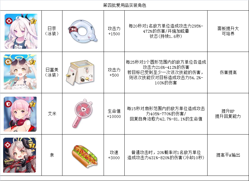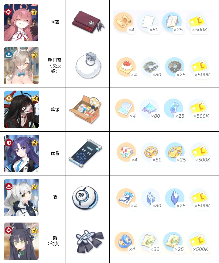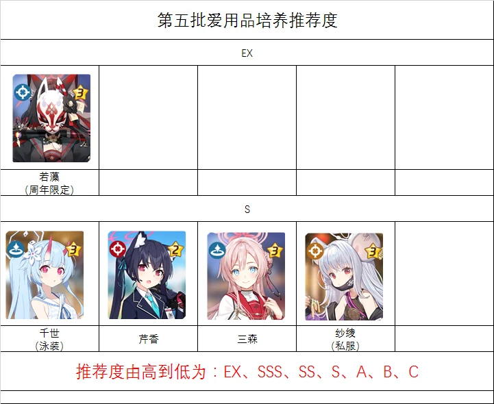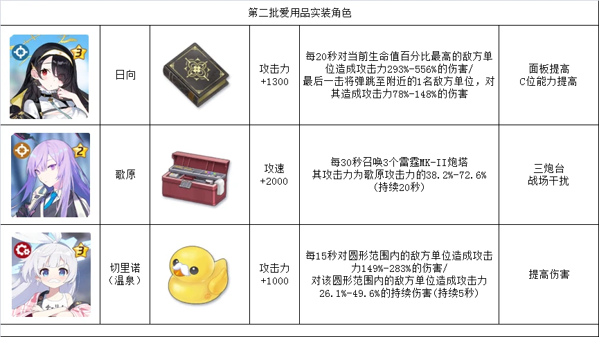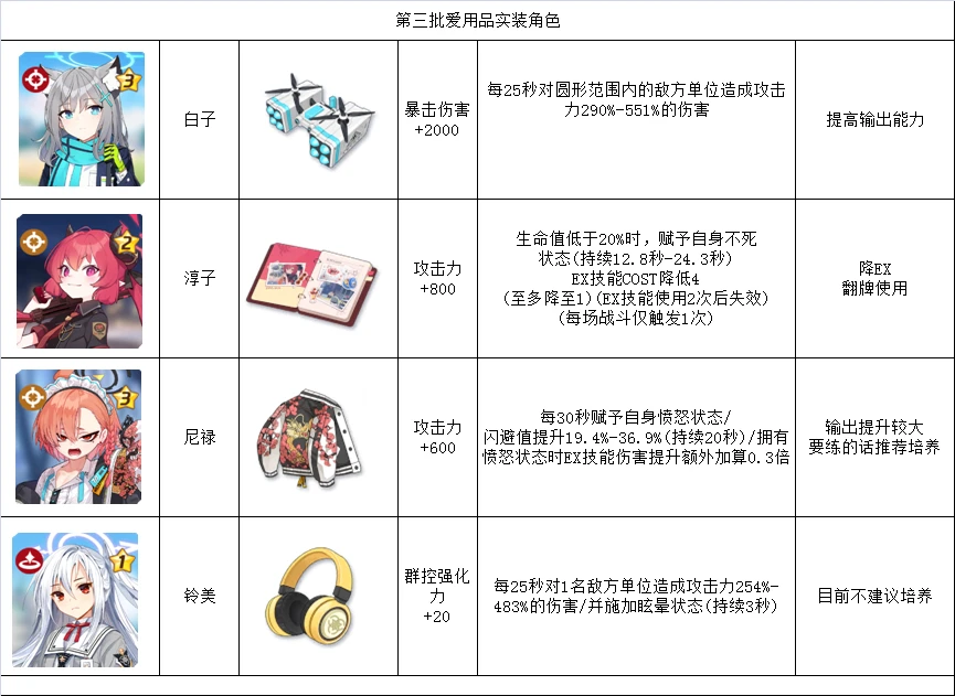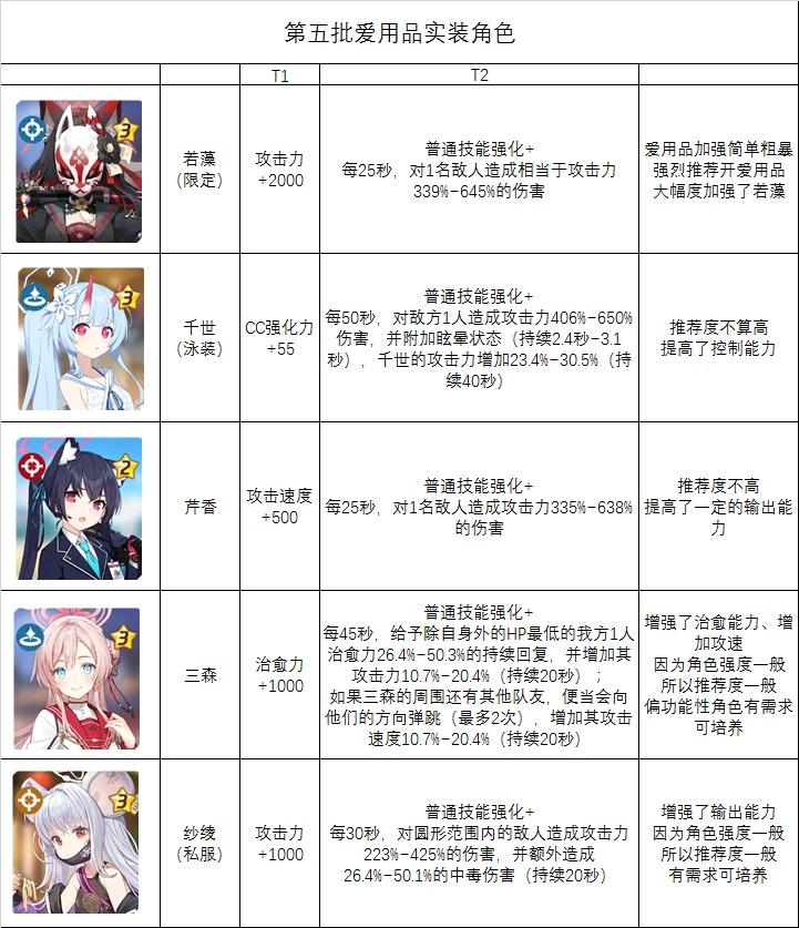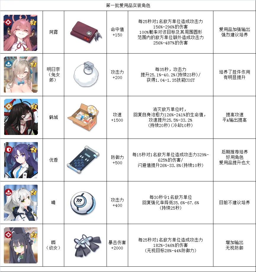【碧蓝档案/蔚蓝档案】角色爱用品培养推荐(升T、数值提升、技能强化效果和培养推荐)猫咪💫发布于 2023-08-03关注爱用品目前已经第五批实装角色了,已经实装的角色开爱用品的条件是角色好感羁绊等级达到20.而爱用品升到T2要好感羁绊等级到25,并且需要指定礼物和材料进行升T。下面是角色爱用品升T2需要的指定物品和材料 实装角色的爱用品培养推荐 作者:叫我洛神就好了
