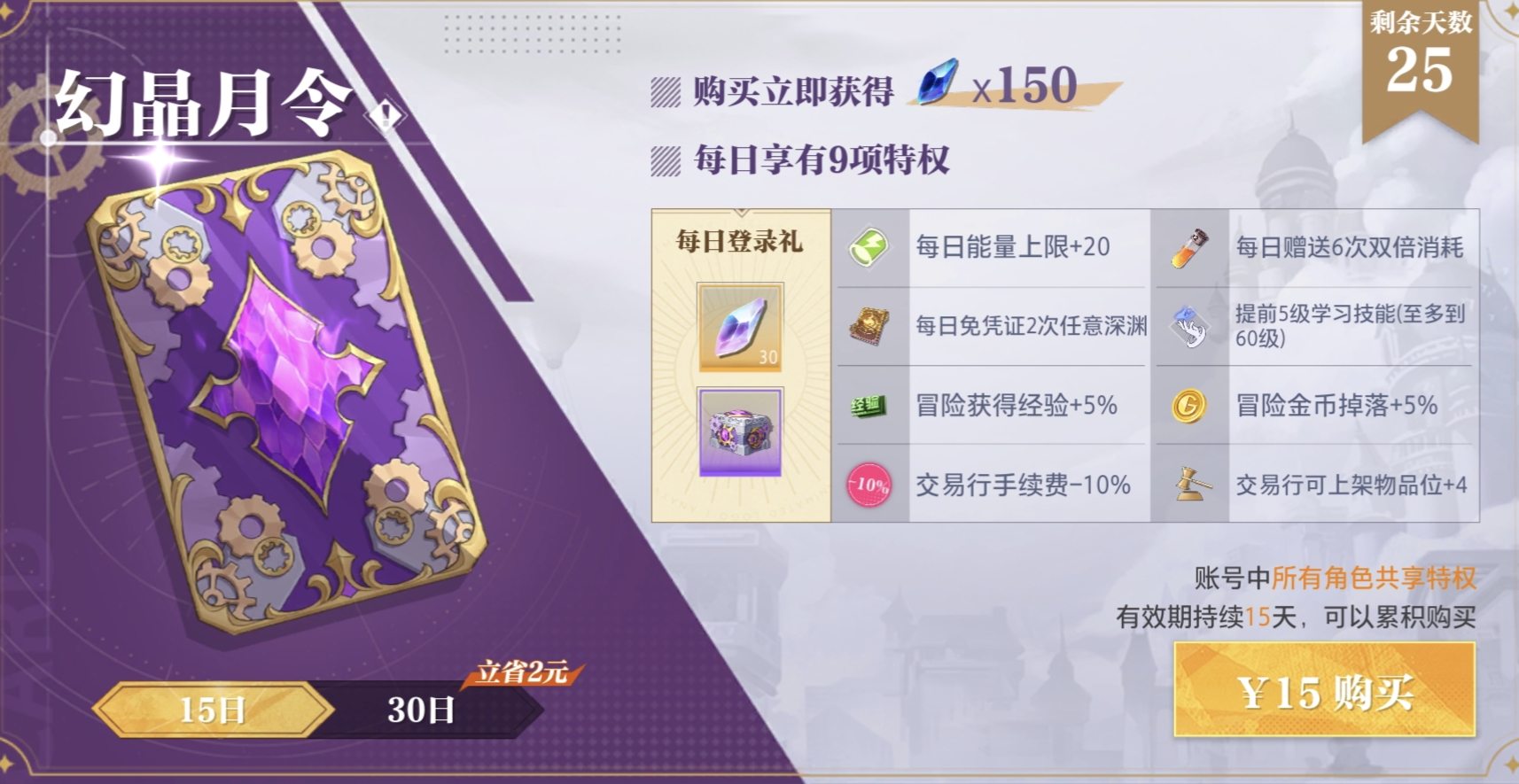 如果是长期玩的平民玩家,幻晶月令强烈推荐必买,有很多好处。不仅可以减少交易行的手续费,同时可以提升金币加成5%。可以大幅度提升获取金币,玩的越久,获得金币就越多。