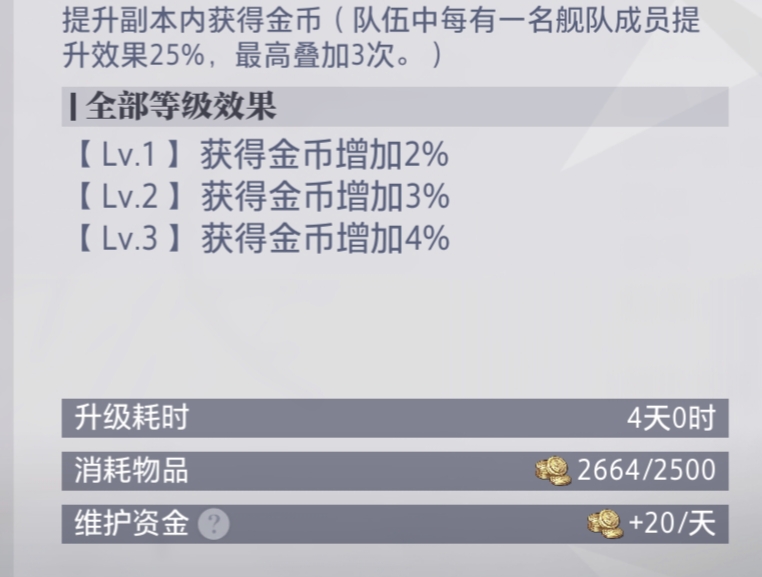 并且这个加成效果和舰队成员组队打金,每个人可以多提升25%金币加成。最高可以和3个舰队成员组队。那就是75%的金币加成。
