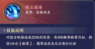 技能说明对敌方纵排造成223%的伤害,有40%概率眩晕目标,持续1回合[眩晕]:携带该状态无法进行行动