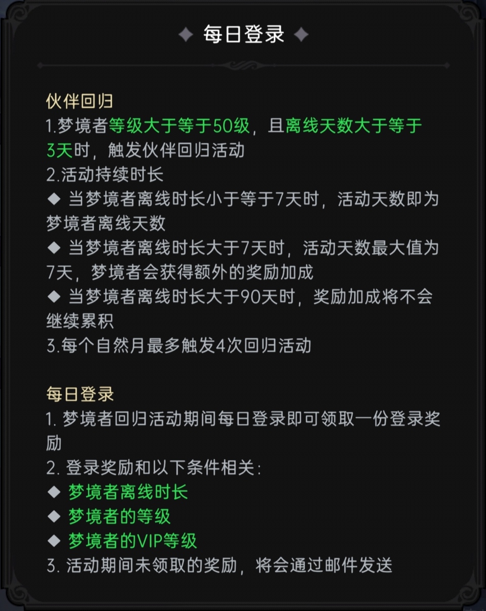 离线2天即可触发(比如你星期一11点半之后下线,那星期四凌晨就可以触发了)然后回归那天+2天期间的收益都会有额外回归特权加成,然后可以兑换
