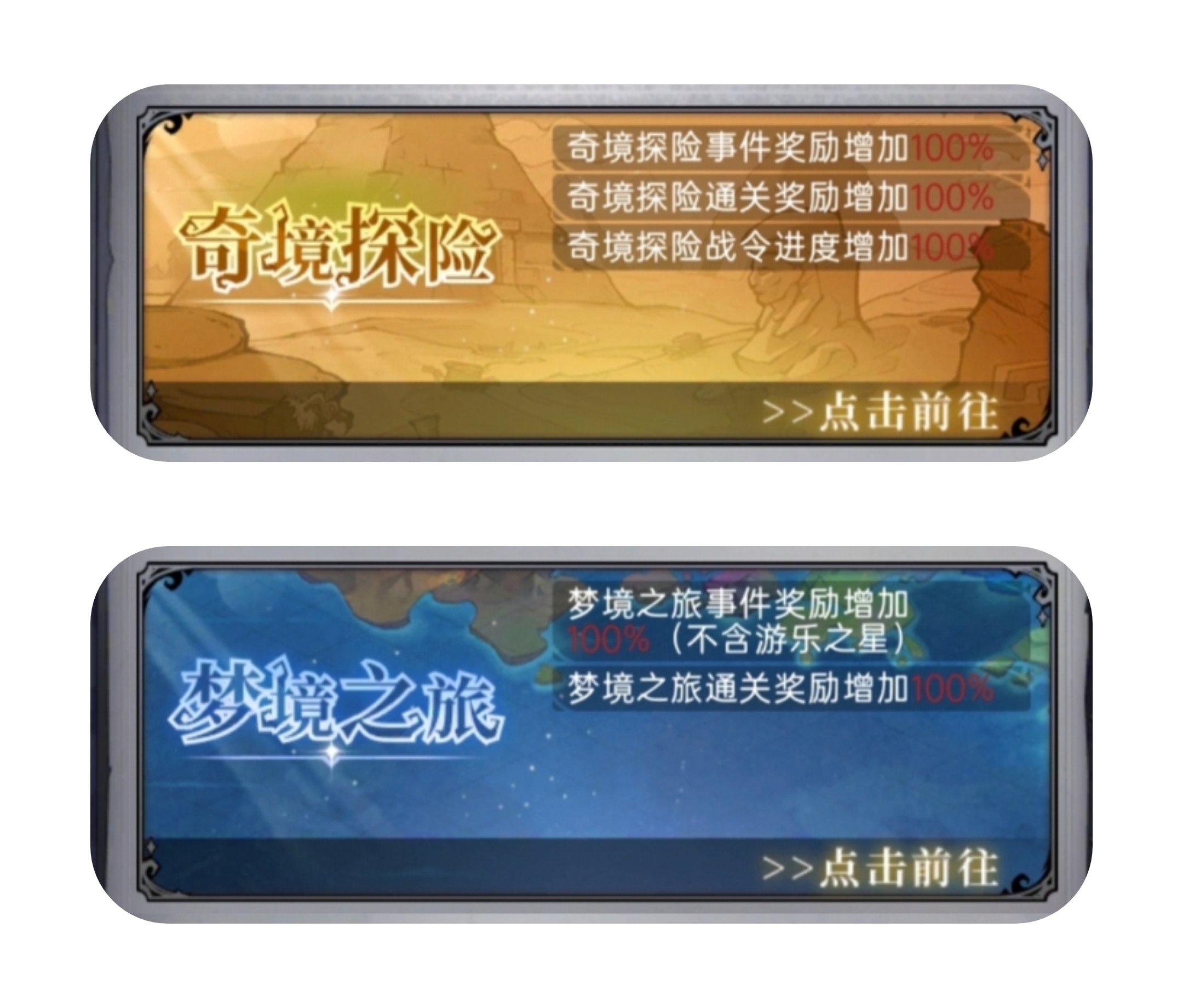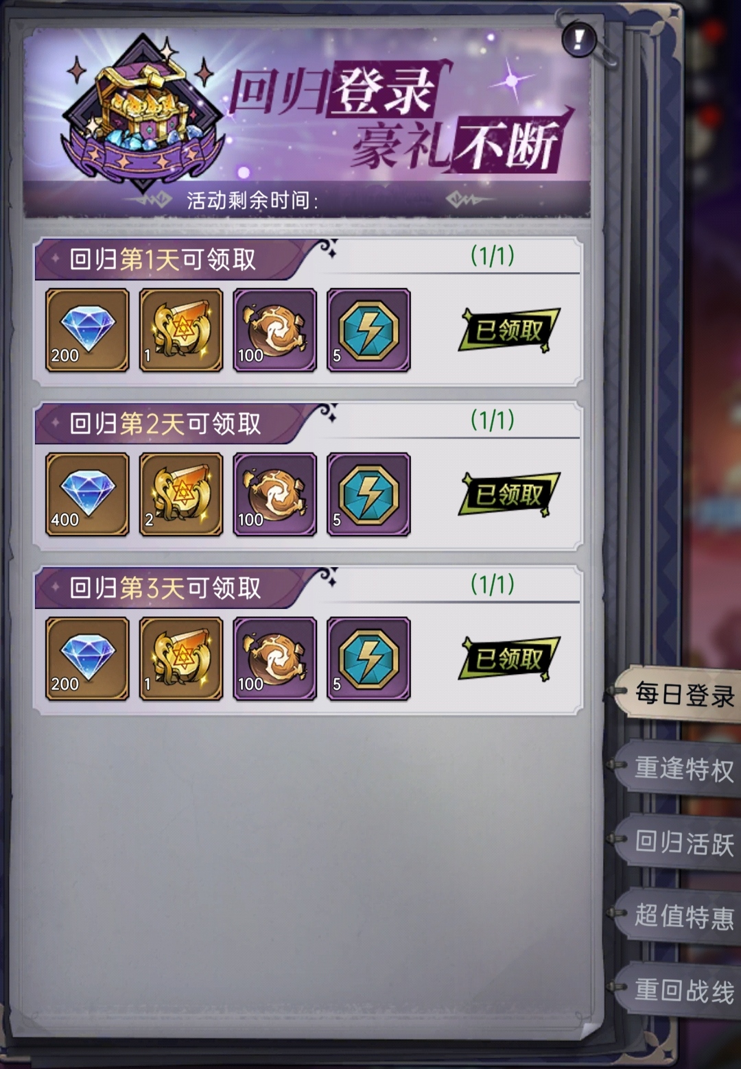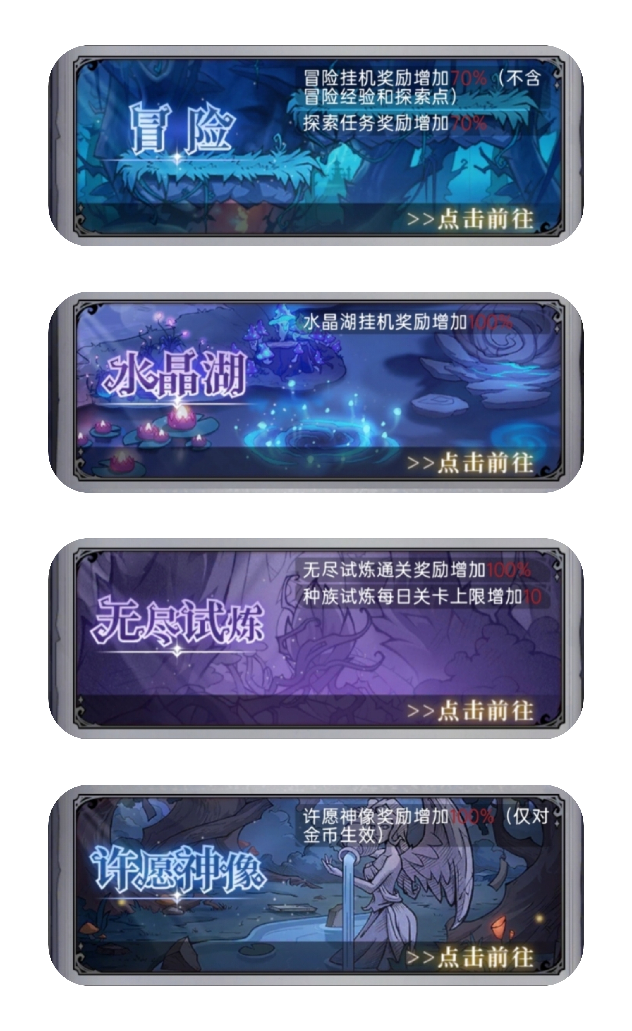 这三个的收益是直接增加100%,意味着回归期间的3天能额外多出3天的水晶湖/无尽试炼/点金