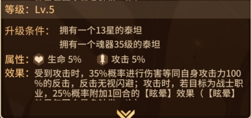 受到攻击,概率反击,对战士概率眩晕,非常强的灵技,非常适合盘古,盘古携带泰坦灵技是最多的。