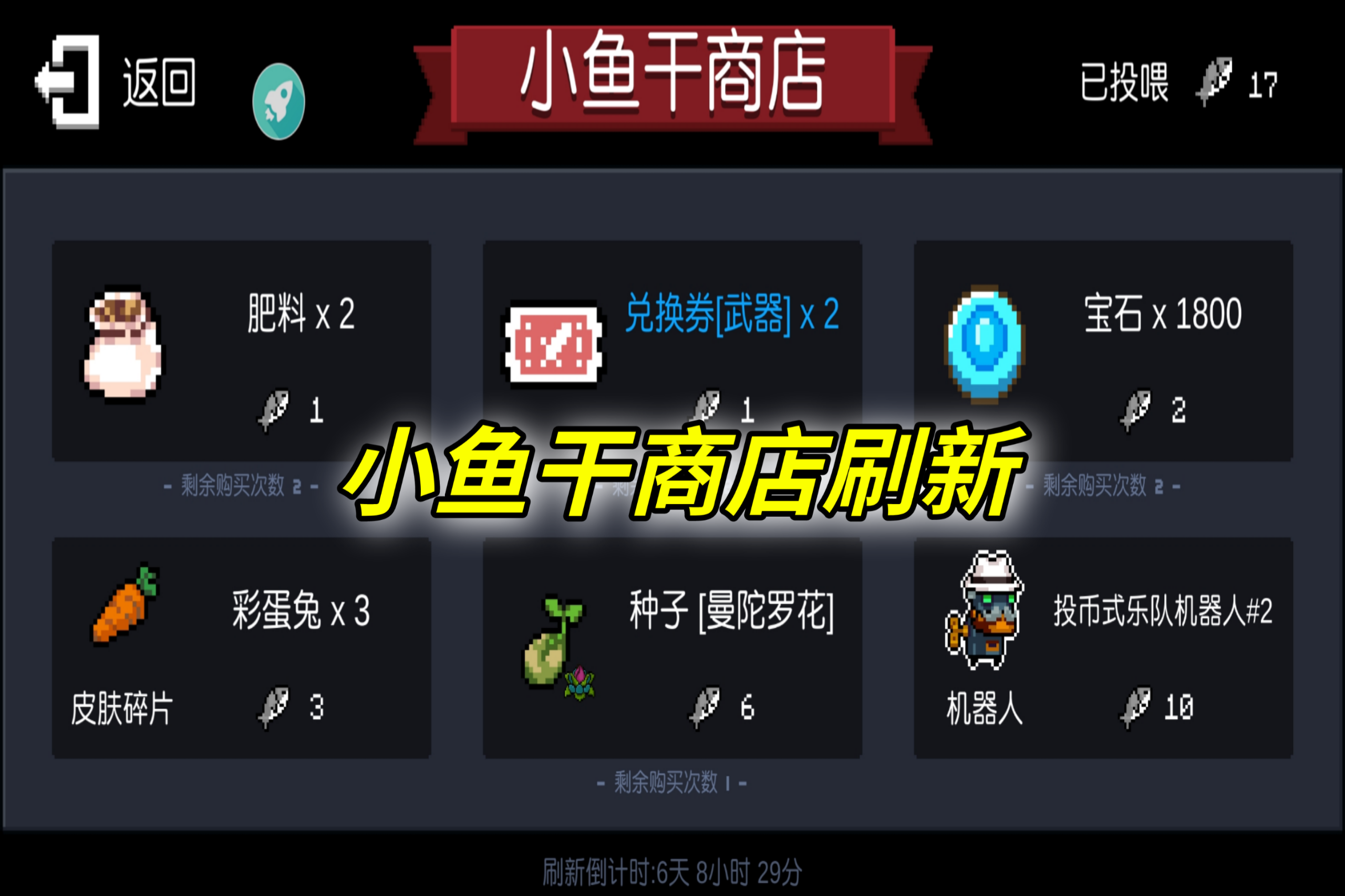 《元气骑士》小鱼干商店再次刷新!这次小鱼干商店当中出现的货物有肥料、武器兑换券、蓝宝石、彩蛋兔的皮肤碎片、曼陀罗花种子以及机器人的皮肤投币式乐队机器人。没有意外,一堆废物当中掺杂着些许的精品。