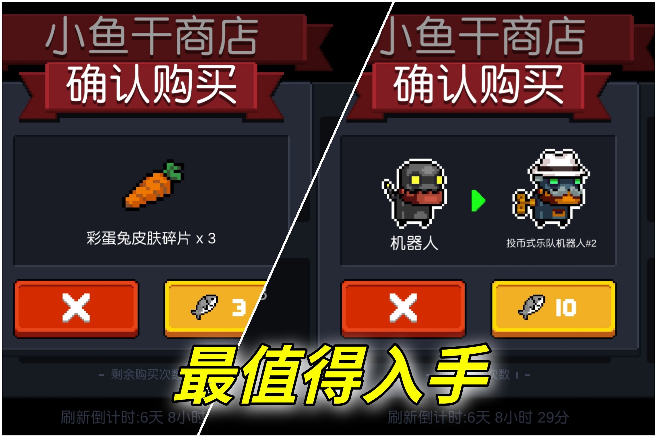 在这6件货物当中,最值得玩家们入手的便是彩蛋兔的皮肤碎片以及机器人的稀有皮肤投币式乐队。其中我们要优先选择机器人的稀有皮肤投币式乐队,需要花费10个小鱼干,也就10块钱。彩蛋兔的皮肤碎片我们可以在后续的地牢闯关当中慢慢获得,但如果你是一名土豪玩家,不在乎的话可以氪金入手。