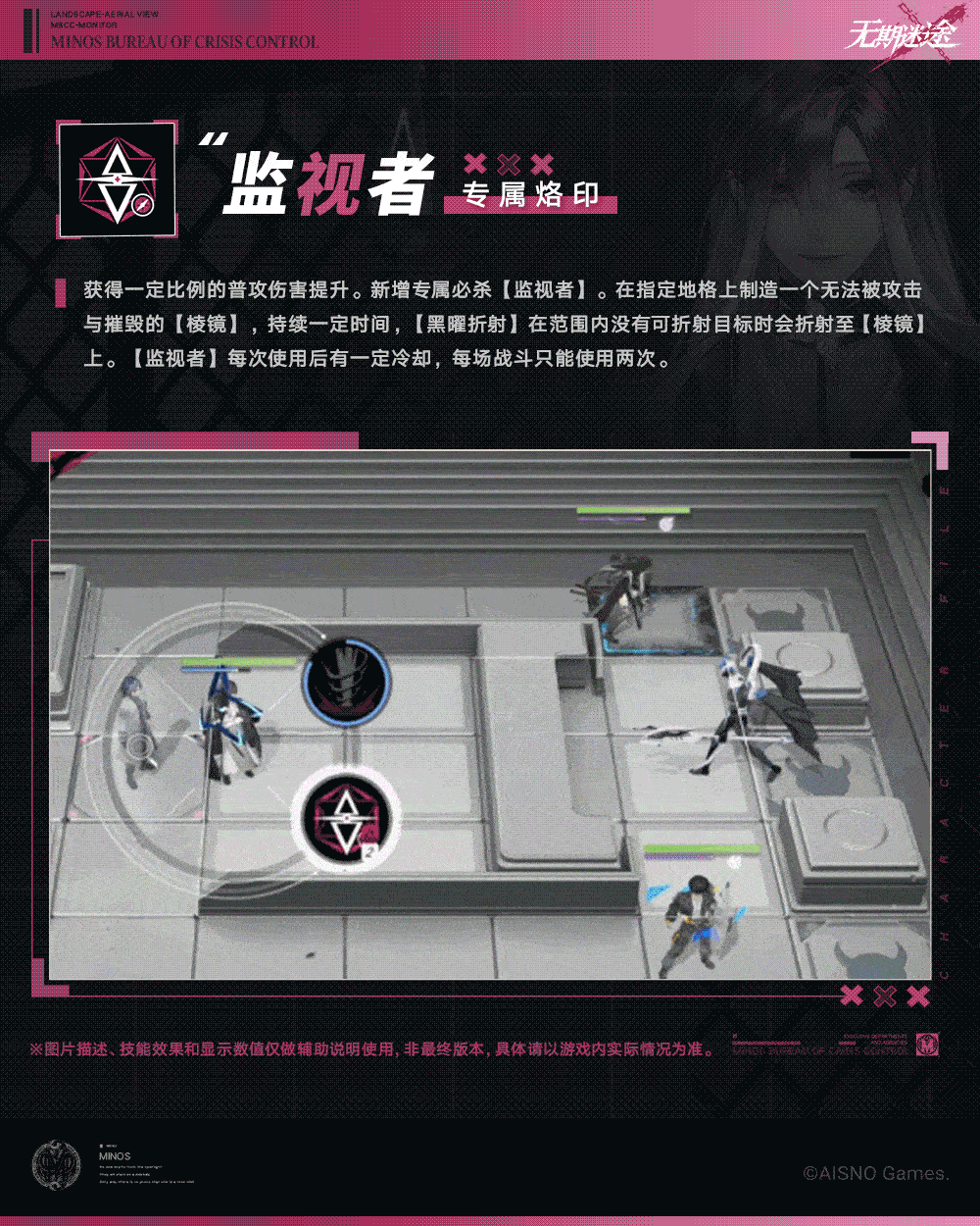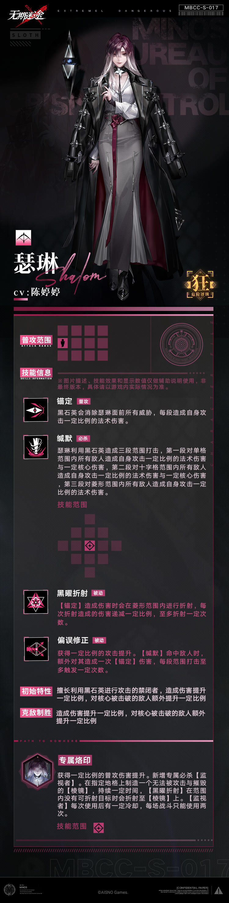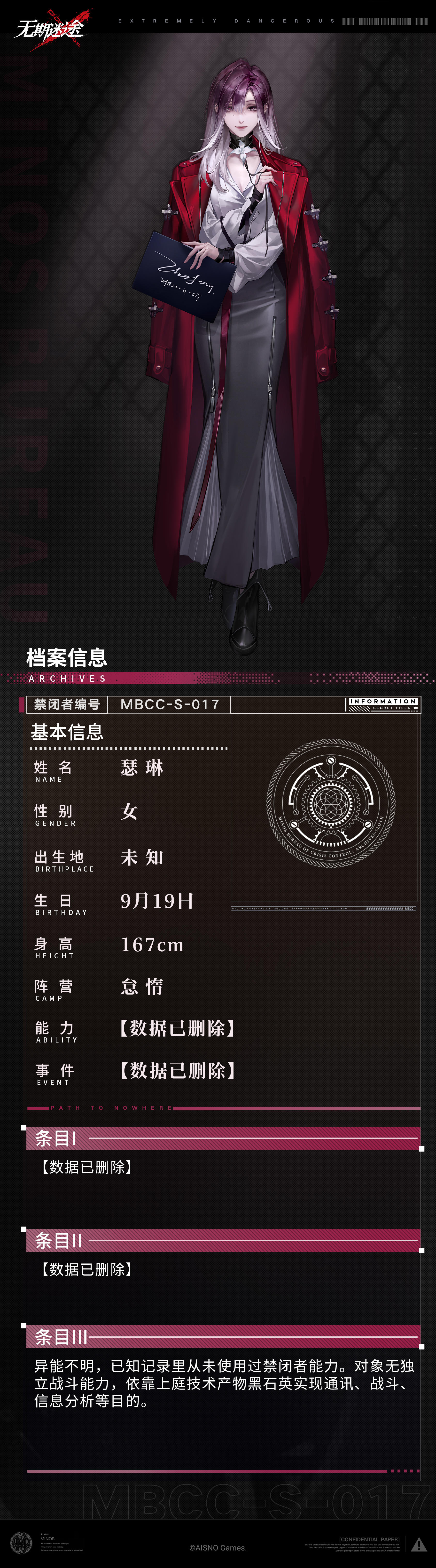 【禁闭者档案】| MBCC-S-017「瑟琳」白喵岚岚发布于 2023-08-07关注[无期迷途]■MBCC-S-017瑟琳■精准特化 Reticle Tendency「一定要这样看着我吗?好呀,那我也要一直看着你了。」 *条目I:【数据已删除】*条目II:【数据已删除】*条目III:异能不明,已知记录里从未使用过禁闭者能力。对象无独立战斗能力,依靠上庭技术产物黑石英实现通讯、战斗、信息分析等目的。■图片描述、技能效果和显示数值仅做辅助说明使用,非最终版本,具体请以游戏内实际情况为准。