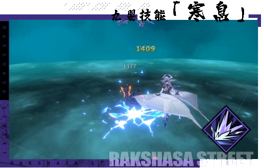 技能【寒息】,九婴居高临下发动强力的寒冰吐息,如暴风雪过境般席卷战场,造成巨额冰属性伤害并且立刻为其叠加高额冰冻值。