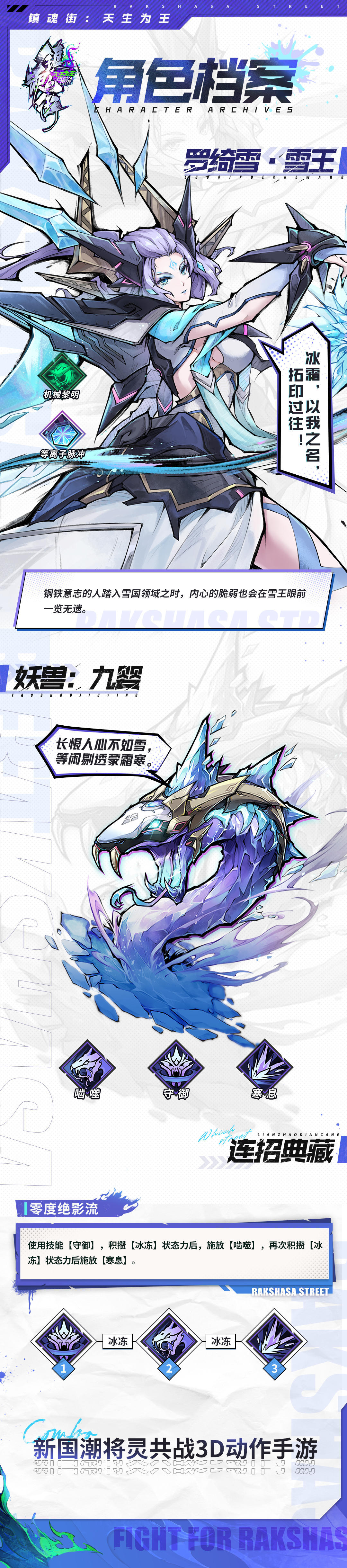 《镇魂街:天生为王》中的罗绮雪·雪王是一位冰属性近距离输出角色,普通攻击【冰刺】进行五段冰属性攻击,在最后一段攻击可以激活寒冰状态力;蓄力攻击【晶凌结阵】将召唤晶凌结阵攻击敌人,造成高额冰属性伤害并激活寒冰状态力;