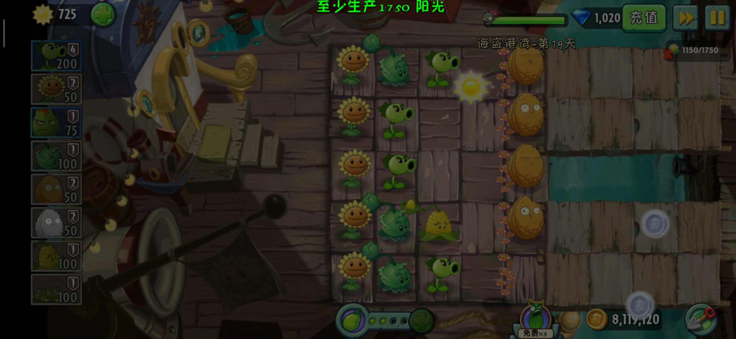 在这一天,没有太多强势攻击、突进能力很强的僵尸,稍微棘手一点的也就是滚筒僵尸和飞索僵尸。所以可以在前期累大量的防御,在这一关中有两座桥,这样其实反而也算是稍微降低了难度,我们在有桥的上下两排尽可能的多种坚果,种两列坚果这样就算大波僵尸来了也不怕防线被很快的突破,而中间那一排只能种一枚坚果,所以中间的攻击力一定要足,不然很有可能保不住花坛。