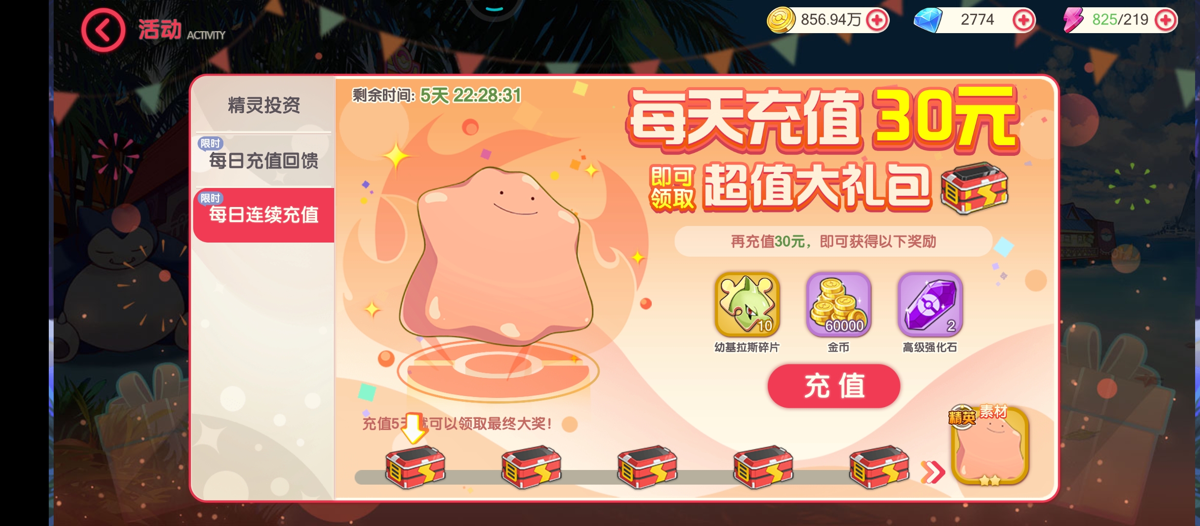 每天30,五天后再送一个橙色百变怪,注意看送的碎片是什么。