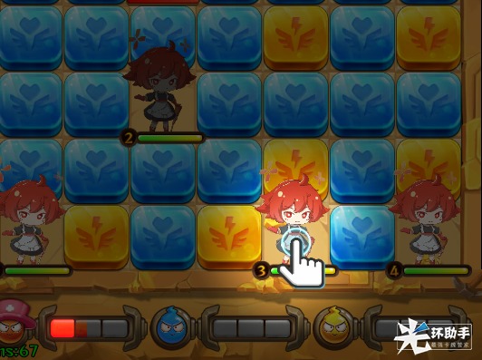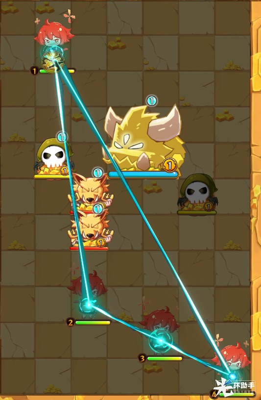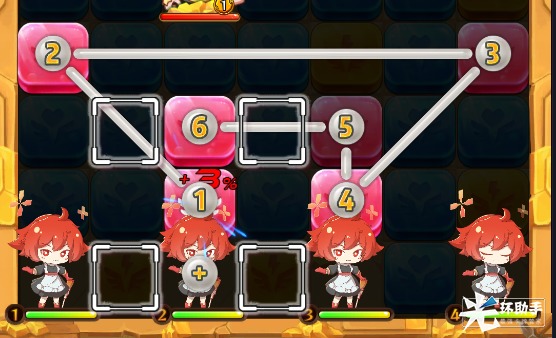 到这一步的话来你已经掌握勇者连线70%连接技术,现在我们来练习连线!按住角色滑动连接所有红色色块,让4位勇者形成包围使用协力技打击怪物。