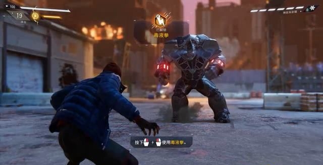 对犀牛人重复使用“闪避+毒液拳”的循环,将其击退即可进入下一阶段的剧情。