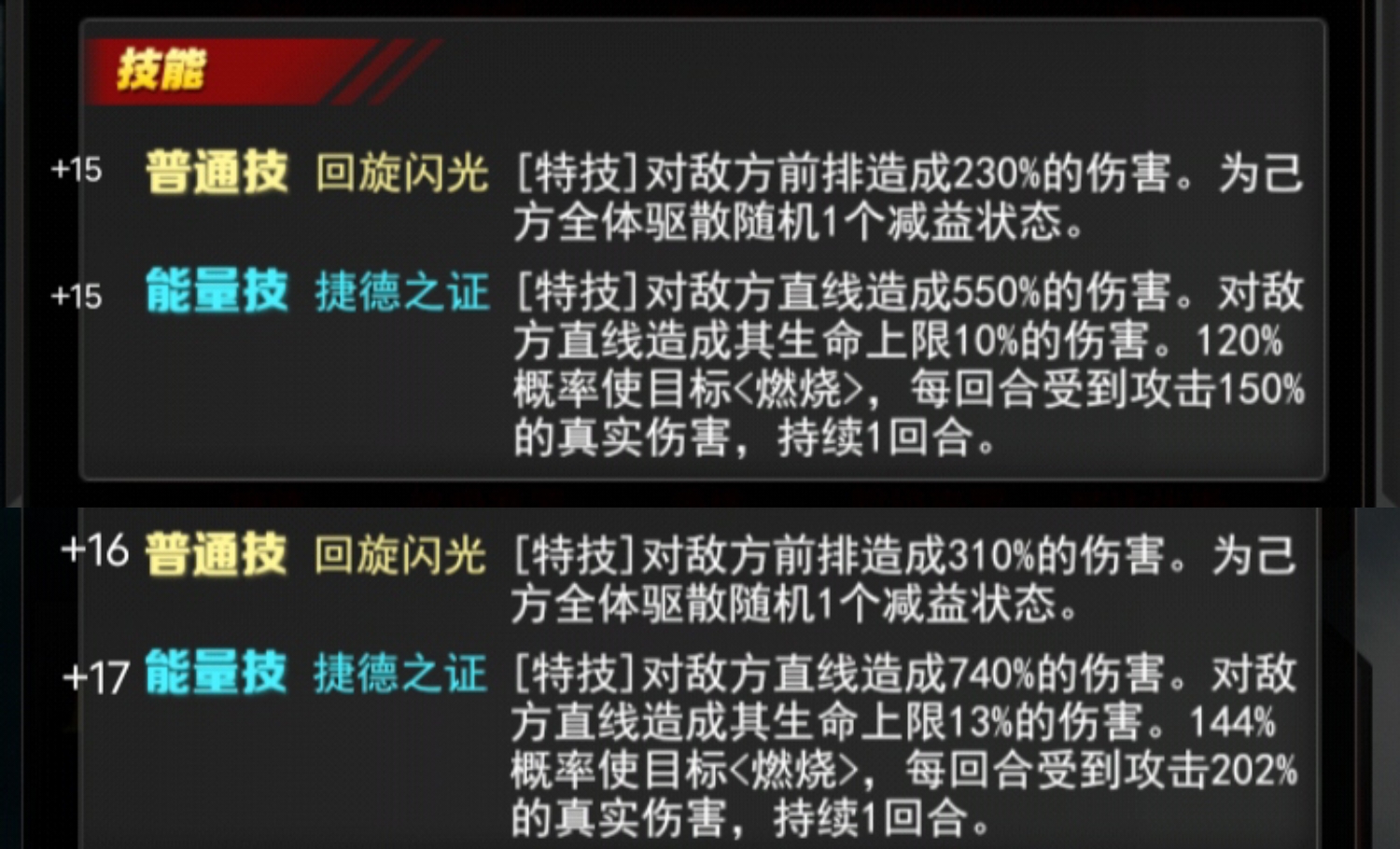 +17 能量技 捷德之证[特技]对敌方直线造成740%的伤害。对敌方直线造成其生命上限13%的伤害。144%