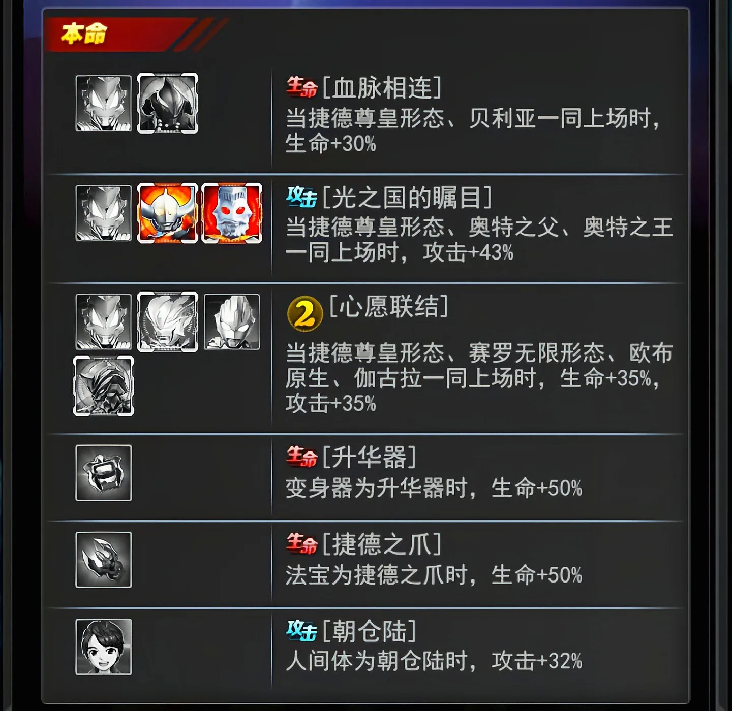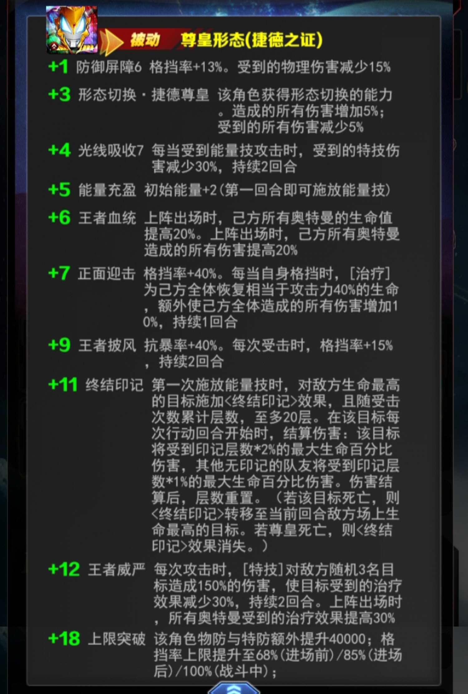 +6 王者血统 上阵出场时,己方所有奥特曼的生命值提高20%。上阵出场时,己方所有奥特