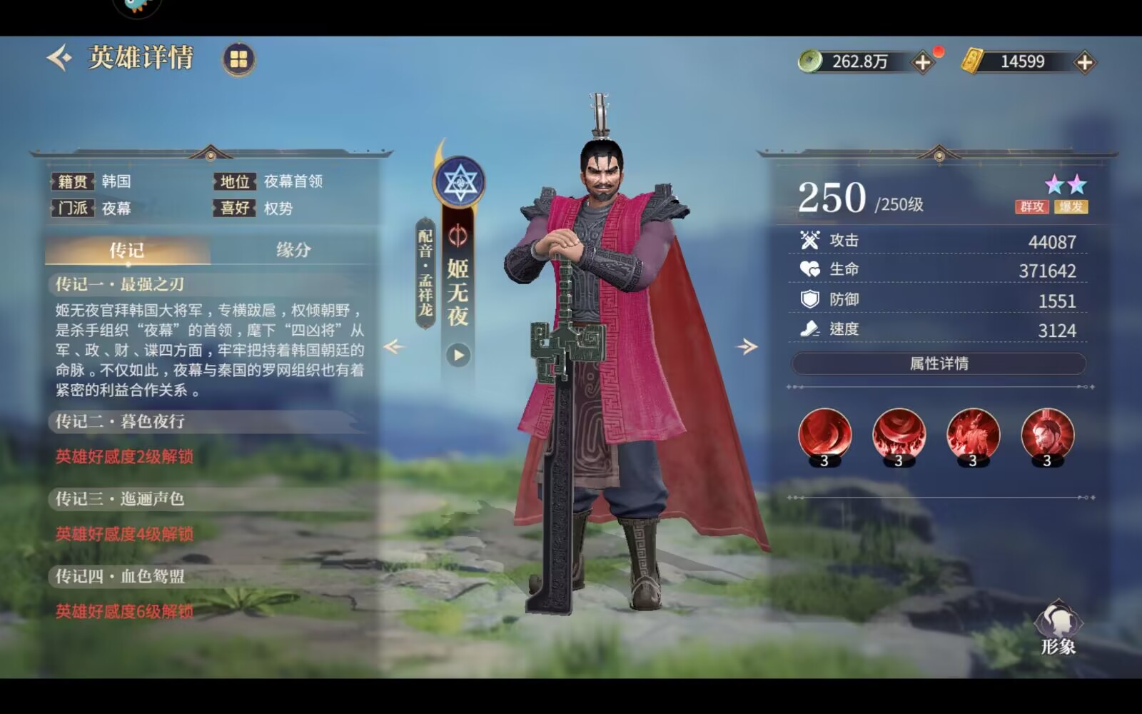 姬无夜兼顾群攻和单攻能力,同时自身被动拥有不错的暴击提升搭配对谋士额外暴击效果,暴击能力优异;同时二技能以自身最大生命值换血消耗可以保证自身伤害阈值,但残血可能会有负提升,容易被处决