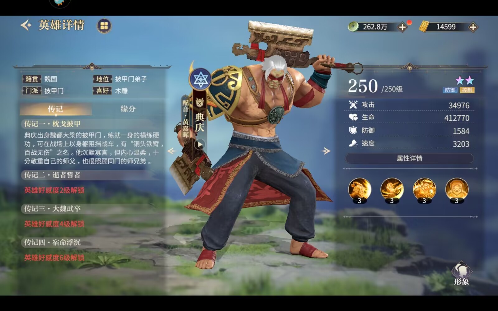典庆作为肉盾拥有不错的坦度,被动高概率免疫物理伤害并反击,同时典庆减益能力亦较强,一技能拥有高概率控制效果,配合自身被动拥有强势的点控能力,可以根据占位克制敌方前排;二技能大幅降低敌方攻击和刺客暴击率可以很好限制敌方主力输出,可以缓解帝国多刺客阵容的高爆发
