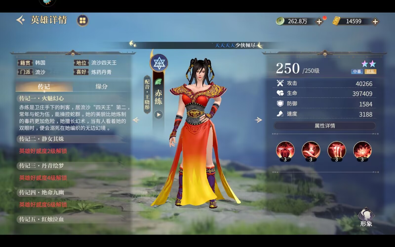 赤练拥有不错的多人混乱控制效果,且持续消耗能力极强,流血&中毒阵容核心,技能附带高概率多层数的中毒状态,配合队友中毒效果叠加消耗能力极强,同时被动治疗己方限疗敌方,拉开双方血量差距,消耗能力较强