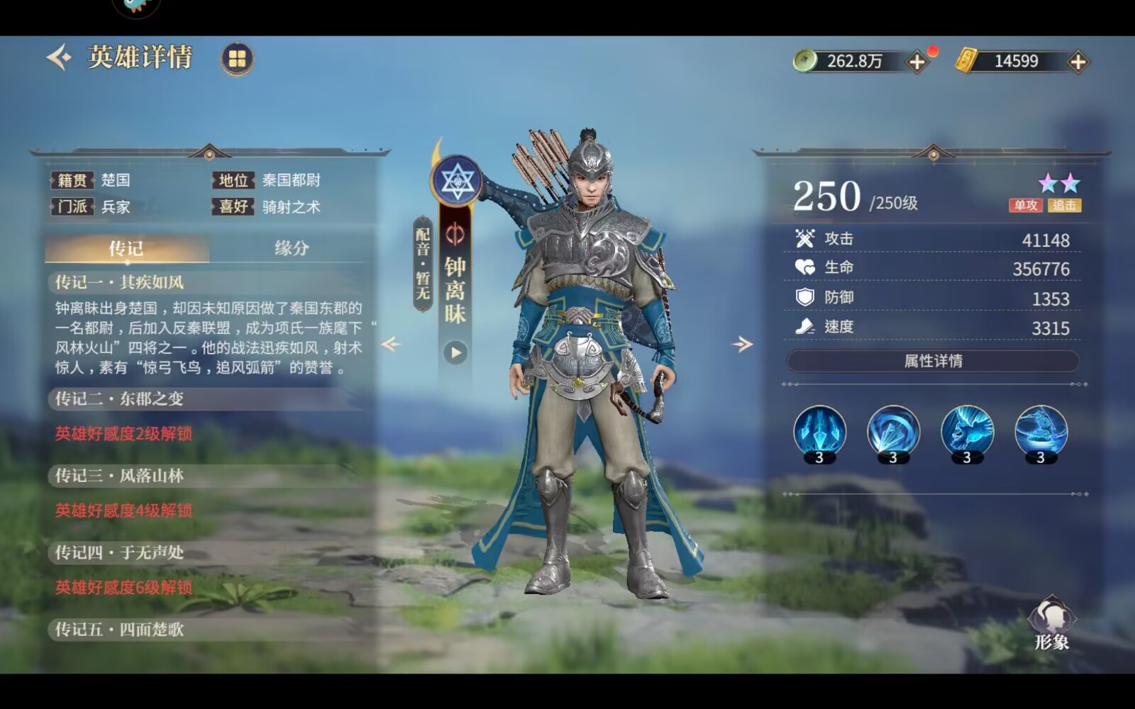 群雄核心输出之一,技能机制简单粗暴,二技能可以精准针对敌方残血搭配超高单体系数+被动额外增伤效果可以实现快速收割能力,同时利用自身先手优势可以造成额外攻击;一技能进行多人消耗同时保证群雄阵容持续伤害能力,但钟离眛伤害极其依赖速度,越战上相对较弱
