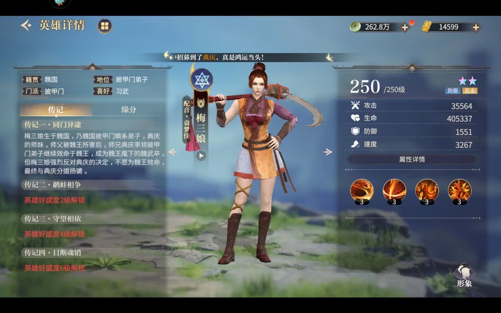 减益型肉盾,自身拥有超强的续航回复能力,二技能拥有不错的抵消物攻+清除负面+回复效果,三者搭配可以大幅提升梅三娘生存环境;同时其主动攻击和反击均拥有不错的群体攻击降低机制,可以极大程度限制敌方输出,拉开双方输出差距