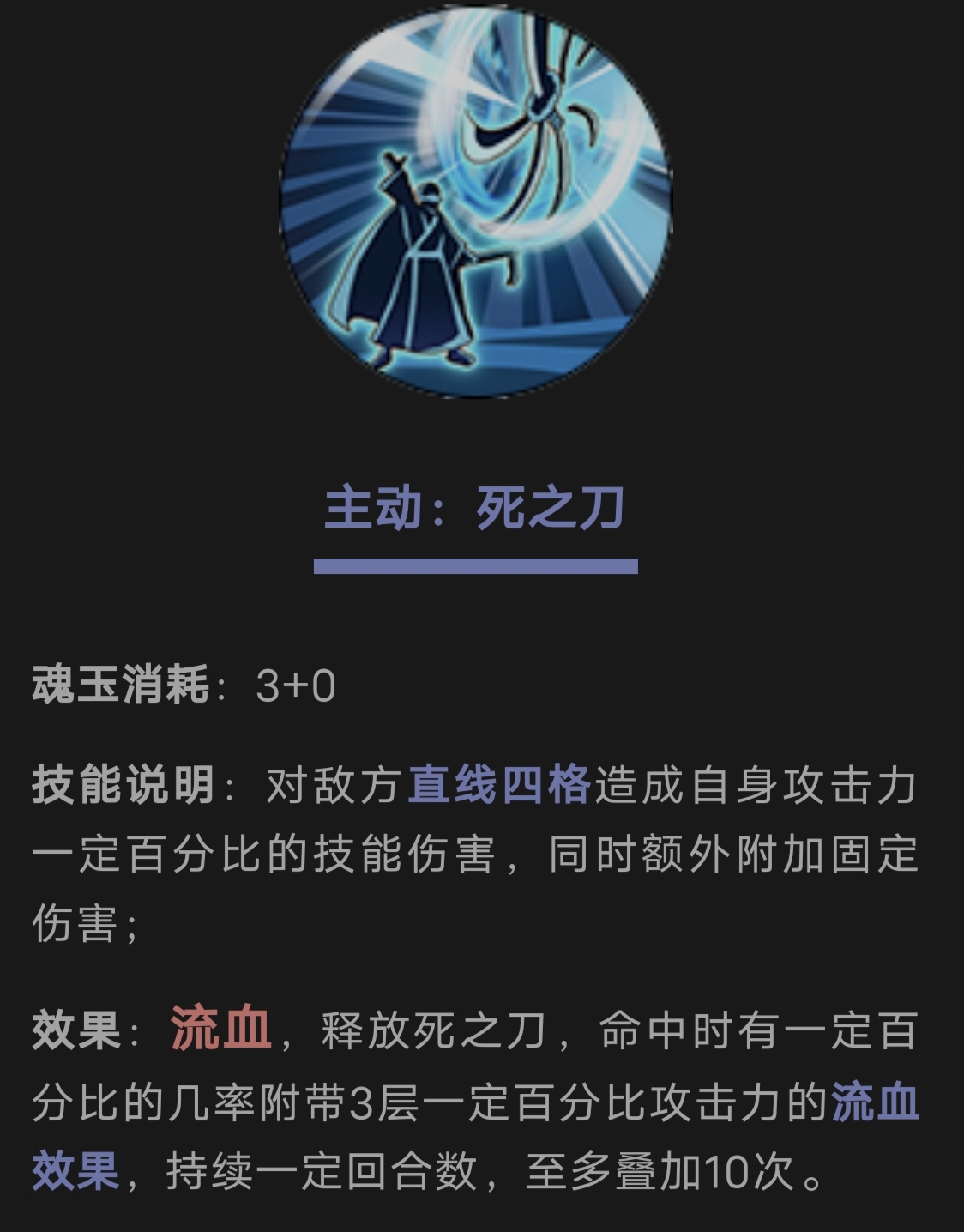 对站在直线四格的敌方人物造成伤害并附带三层流血,最高30层,这个没啥看头pve带带