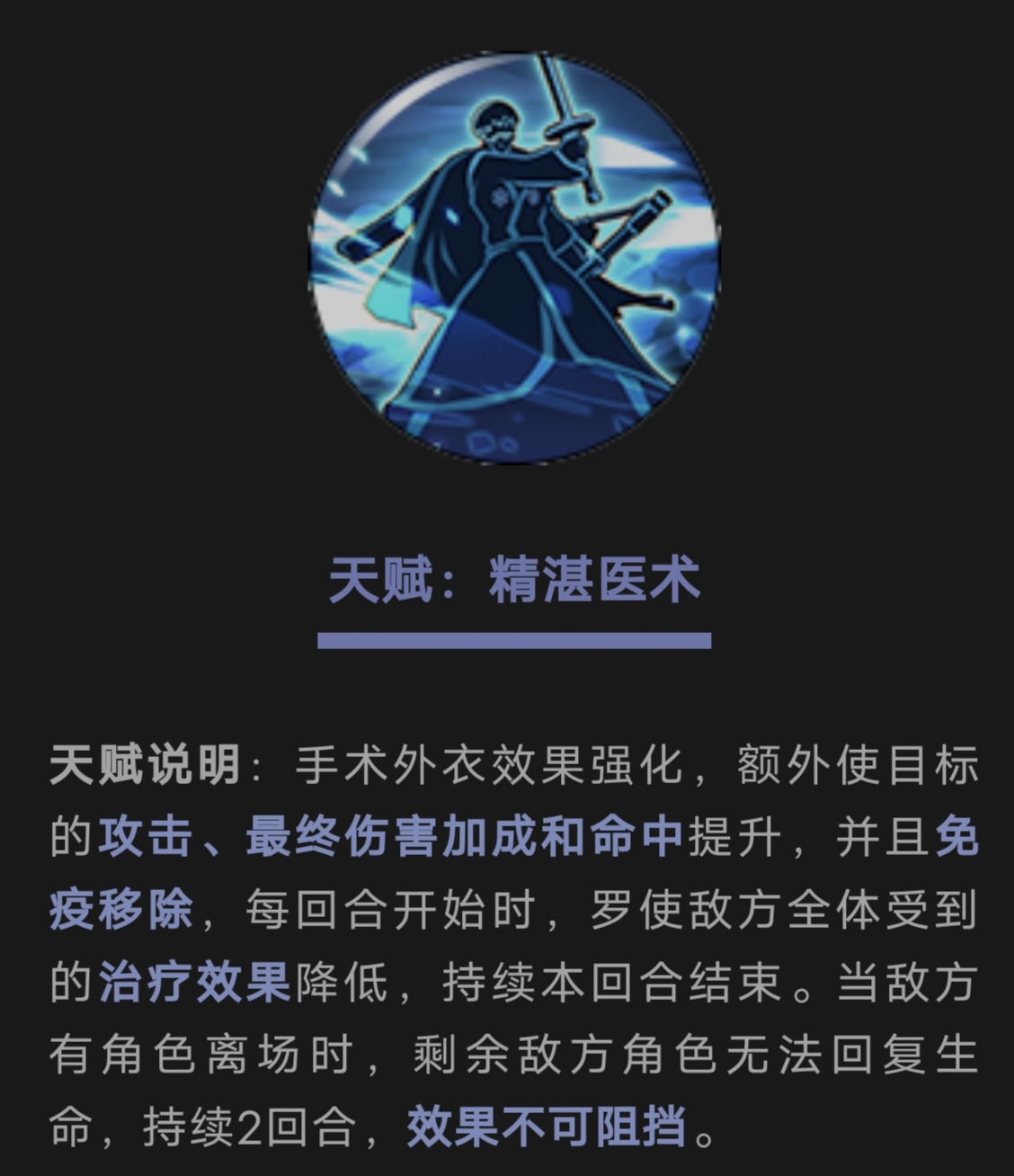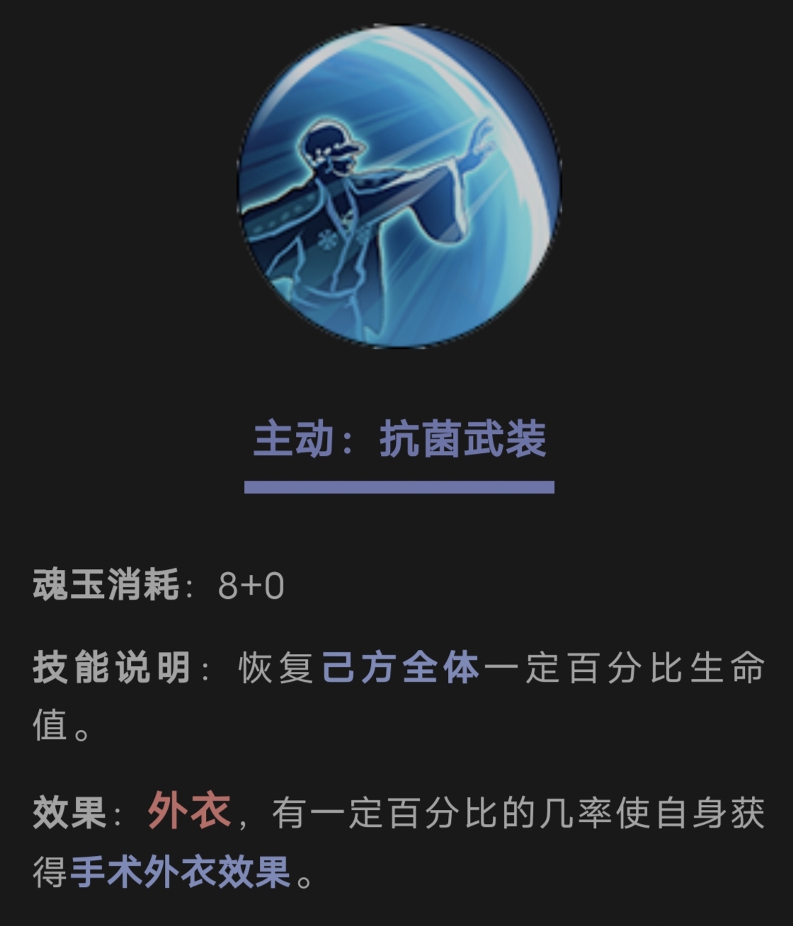 加强外衣效果,使获得外衣的人物额外加成攻击,伤害加成,命中,并免疫移除,回合开始时,让敌方治疗效果降低,本回合结束后效果消失,敌方任意角色离场,剩余角色无法回复生命效果不可阻挡。加强外衣的效果,针对回复生命的角色,节奏又快了