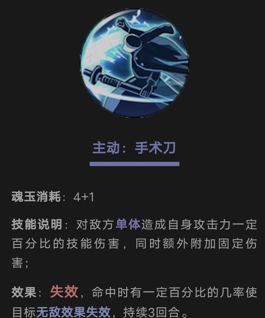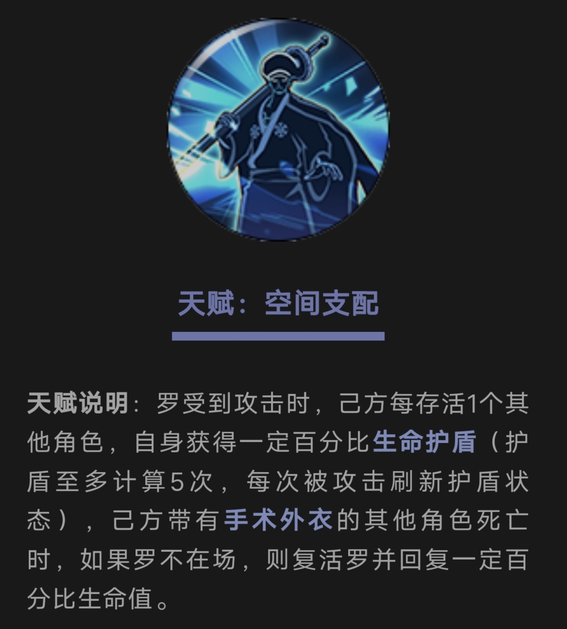 罗受到攻击时,我方活多少人获得多少次的护盾,比如你场上剩一个人,打一下获得一次护盾最多五次,罗被攻击到刷新护盾状态。我方带有外衣效果的人物死亡后,如果罗不在场被打死了,则可以复活罗并回复一定的百分比,保命方式是这个有点赌,加强罗的生存,不过这个保命有点烂