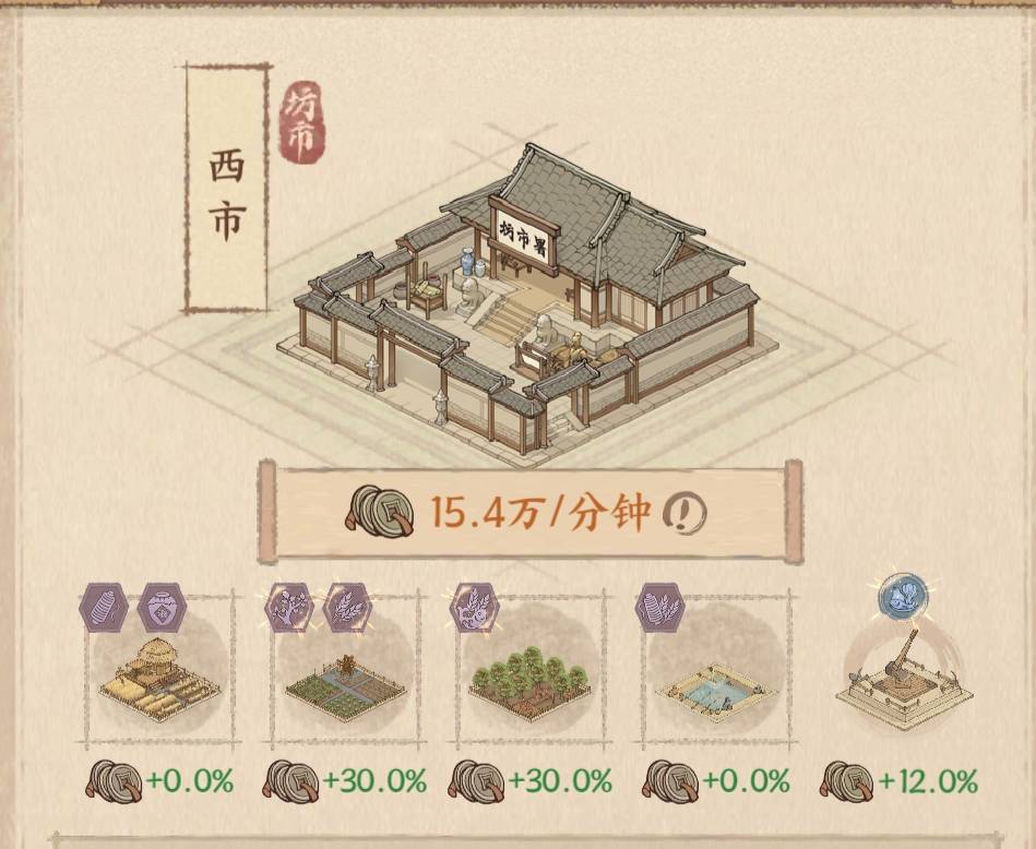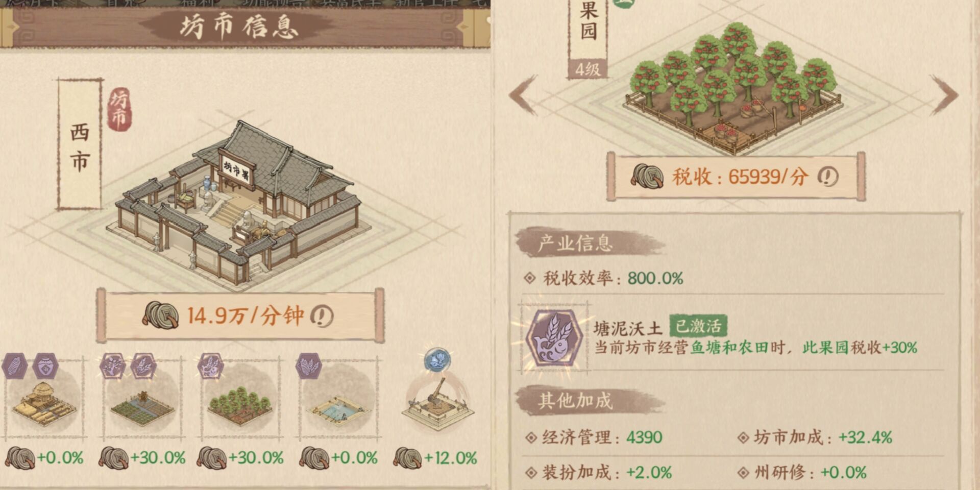比如:坊市经营【鱼塘】和【农田】的时候,就优先升级果园,这么做的好处是可以大幅度提高税收。