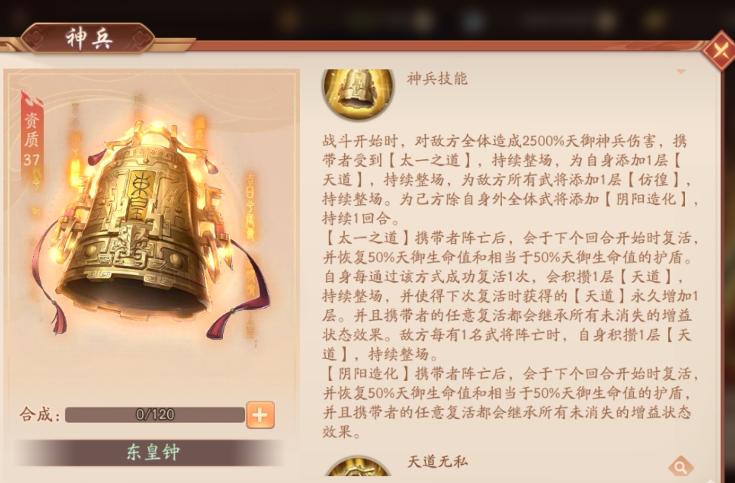 主动:携带者主动出手时,对敌方全体造成3000%天御神兵伤害,并根据“天道”层数造成额外效果。当自身拥有1层以上时,使我方全体武将从主动出手中获得25%的吸血效果,血量溢出转护盾,持续1回合,并为敌方随机1人添加1层“仿徨”,持续整场。当自身拥有3层以上时,降低敌方前排25%的天御基础攻击和天御基础防御,持续1回合,并扣除其2点技能值和50点将力值。当自身拥有5层以上时,回复己方基础攻击最高1人每人50点将力。如果己方存在阵亡武将,消耗所有“天道”,复活随机1人,并回复其50%生命值和相当于50%生命值的护盾,无敌1回合。并根据消耗的“天道”转化为同等数量的“仿徨”随机添加给敌方全体。