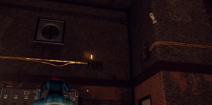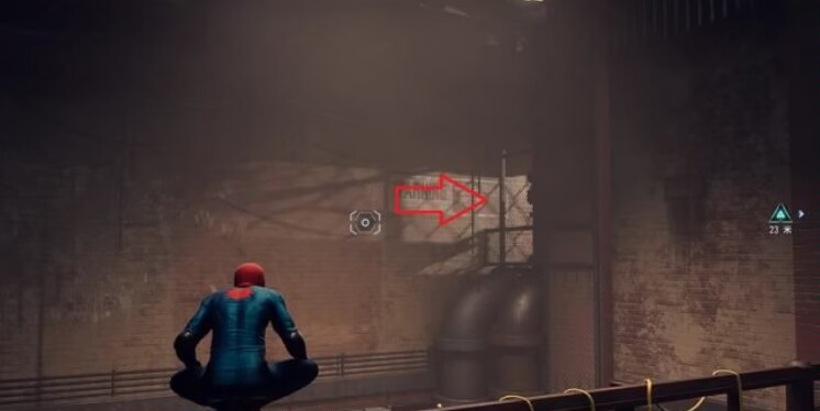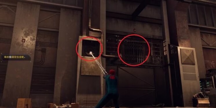 长按“鼠标中键”开始瞄准,对着下图中标记的两头线段发射蛛网即可连接电线。