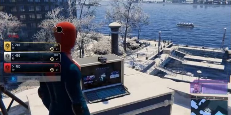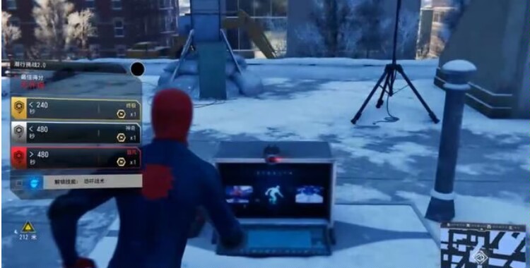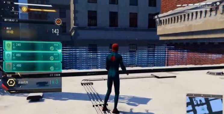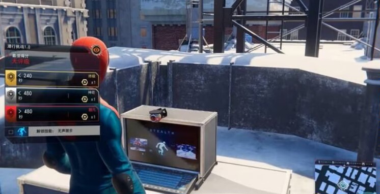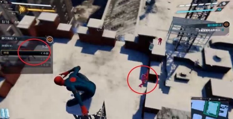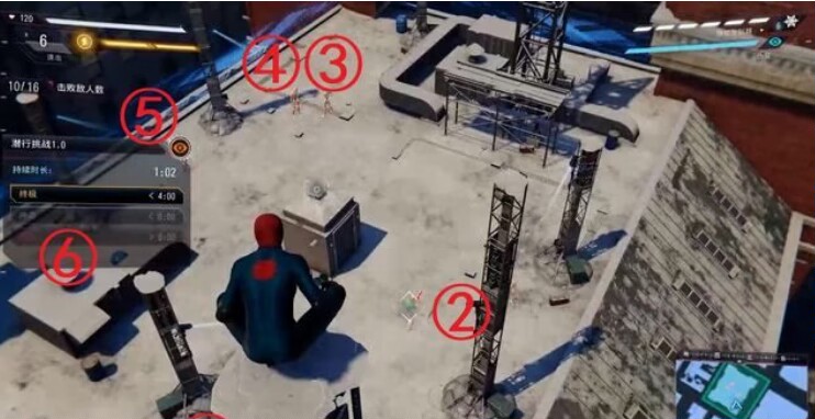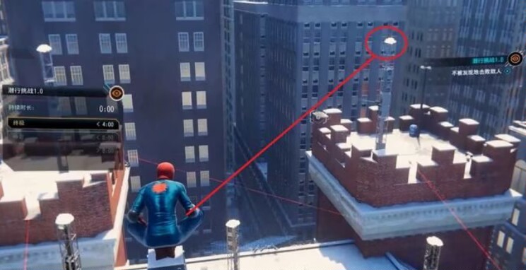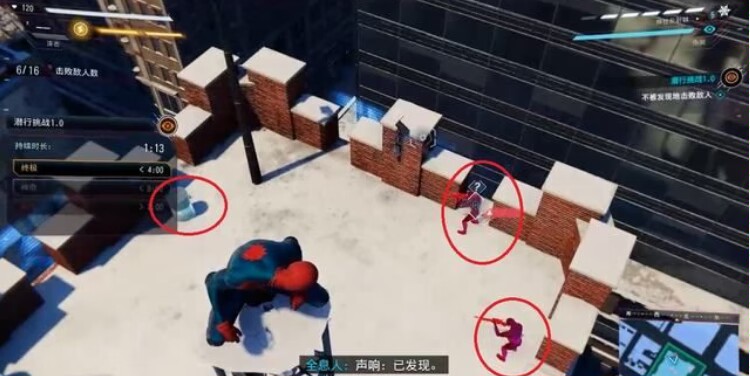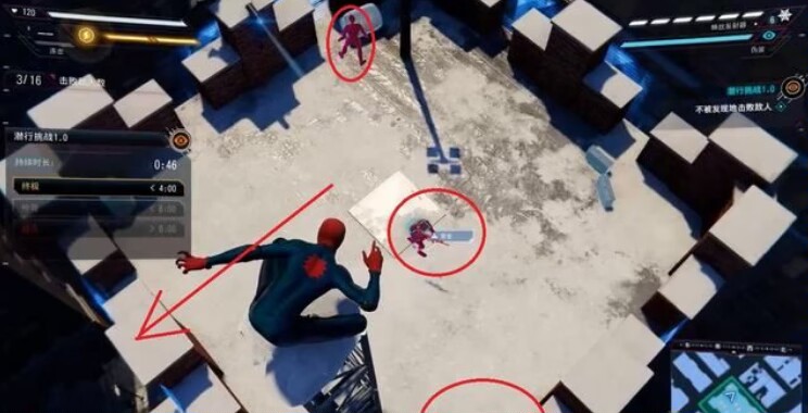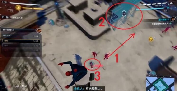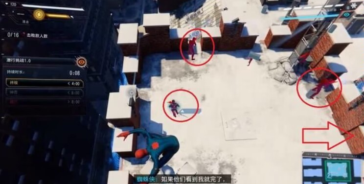 最后一个角的敌人通常会站在一起,不过只要对着一旁的铁桶发射蛛丝,将敌人引开即可轻松解决。