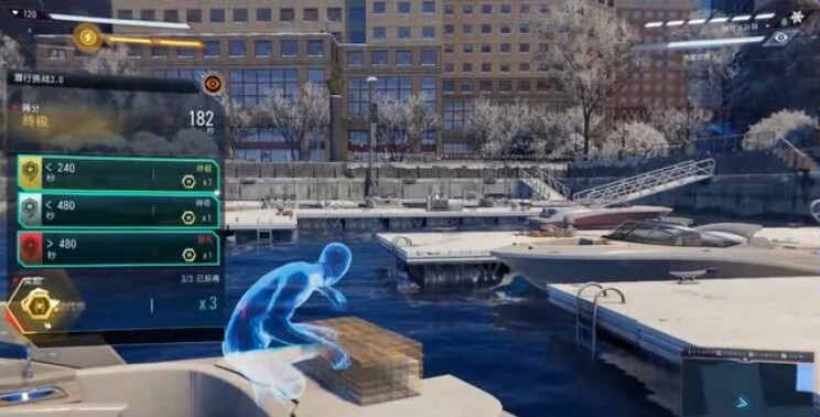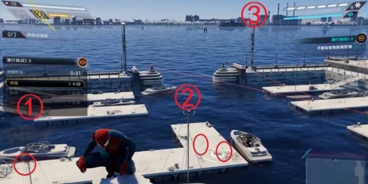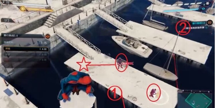 金牌全息挑战:潜行挑战(2)木木虫发布于 2023-08-10关注 金牌全息挑战:潜行挑战(1) 第一个挑战在上东区地铁站的右侧。 在地图上标记该挑战后,跟随指引前往触发即可。 获得金牌需要将完成时间控制在240秒内。 第一步,前往右侧的信号塔。 下图中的三个敌人基本都是相互独立的,因此扫描确认安 第一颗炸弹,先飞到左侧桅杆击败脚下的敌人,再飞到2号桅杆,转移注意力后隐身拆弹。备注:如果系统提示靠得太近或有人没走开,就逐个击破就好(最好别显形)。之后前往3号位置的信号杆。 击败一旁的1号敌人后飞到2号桅杆,瞄准星号位置吸引敌人,处理一旁的敌人后隐身拆弹。 第三颗炸弹就在一旁的船上,隐身拆弹即可完成挑战。 完成挑战可获得三枚活动代币和独特技能。