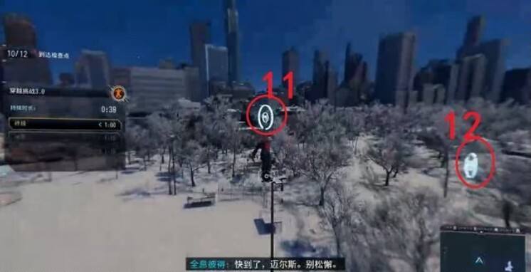通过检查点10后继续沿着灯柱前进即可看到11和12。