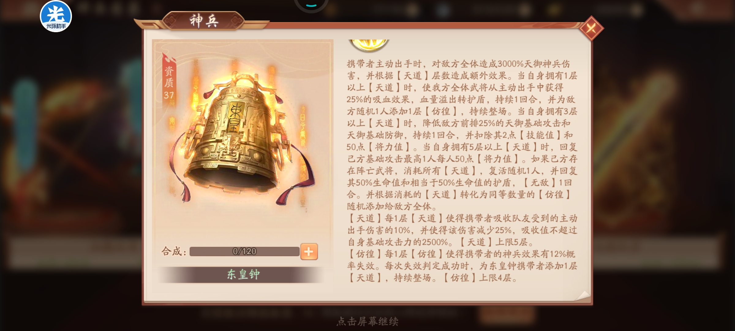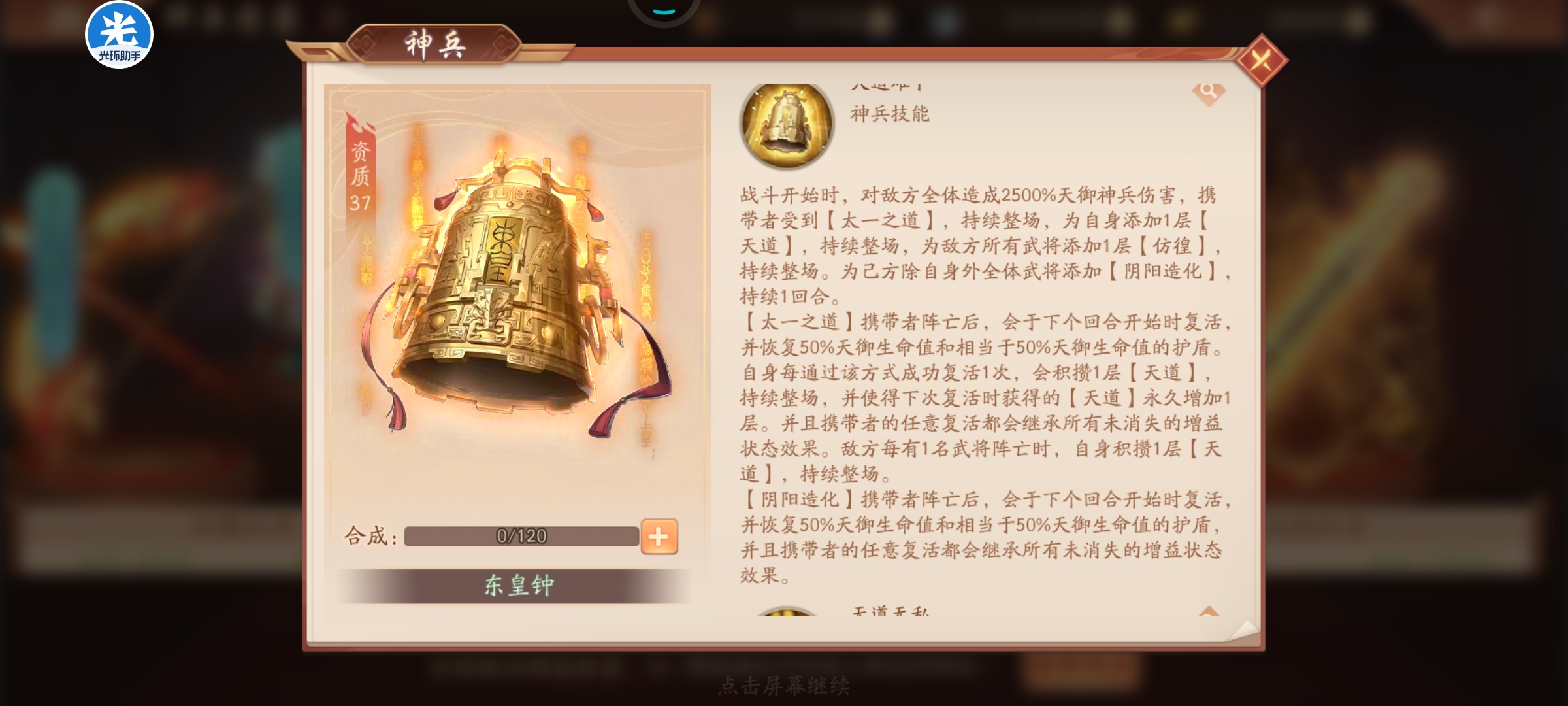 总结:注意标题,我之所以叫献祭流东皇钟是因为我觉得他跟我之前想的一个玩法很适配,首先队友的【阴阳造化】只有一回合,那么就是说队友在第一回合全灭的话,第二回合开始就全体复活了,那么该如何利用这个东西呢? 没错,就是我之前提到的赵云配赤金将,开局赤金送一波,赵云框框输出,第二回合队友起来,又送了,赵云再框框输出,赵云本身比较刮,但是如果有鲁肃和金箍棒,那伤害就很高了,这里的赵云甚至不需要星宫扶持,因为队友阵亡送的能量太多了。所以可以这么玩这个神兵,我后面换到了肯定会测试一下的,东皇钟给队友带就行了。