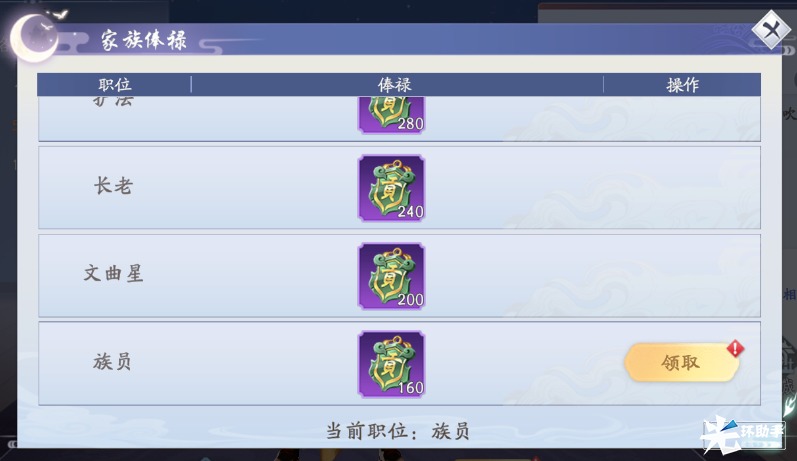 加入或者创建家族后就可以领取家族工资了,根据家族的职位高低会获得不同数量的家族贡献。