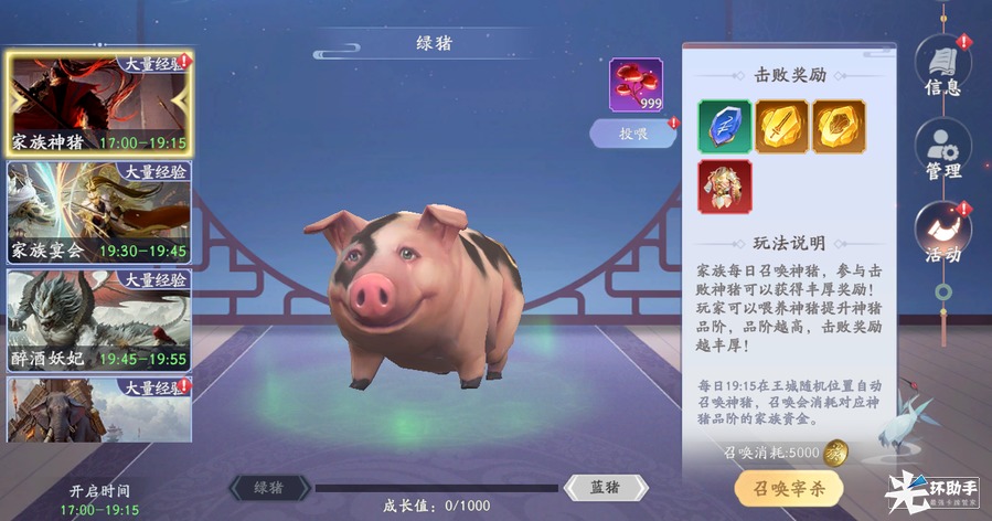 活动时间在每天下午17:00到19:15,族长可消耗5000家族资金手动召唤神猪,或者等待系统自动召唤,不过系统自动召唤会把神猪的质量降低1级。