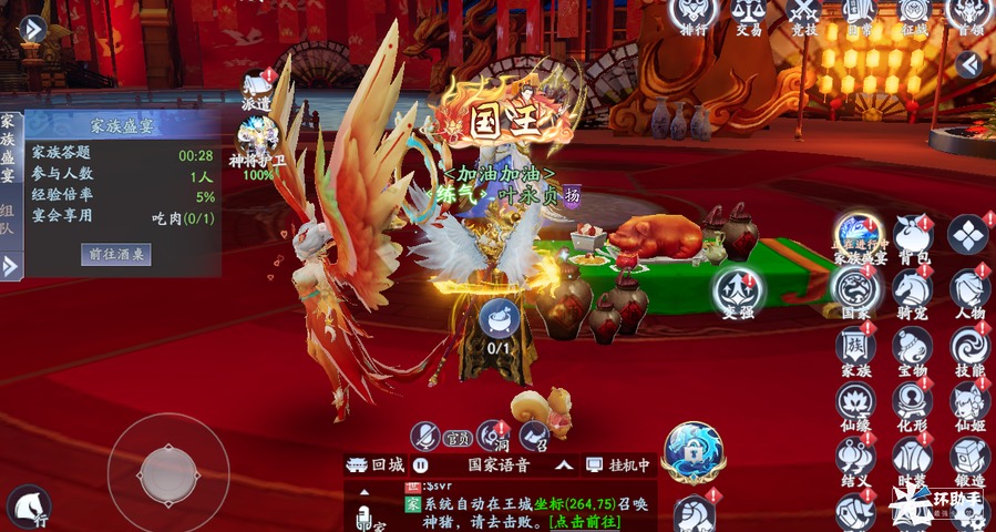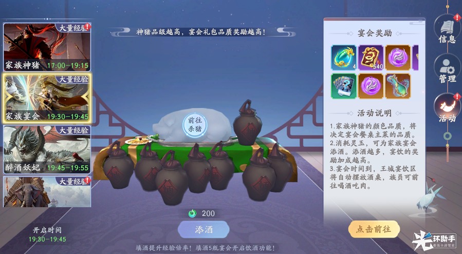 家族宴会每天固定晚上19:30开始,到时候点击回城就可以进入家族宴会的区域,待在区域挂机就可以获得经验,别忘了点击一下吃肉,可以领取额外的奖励。