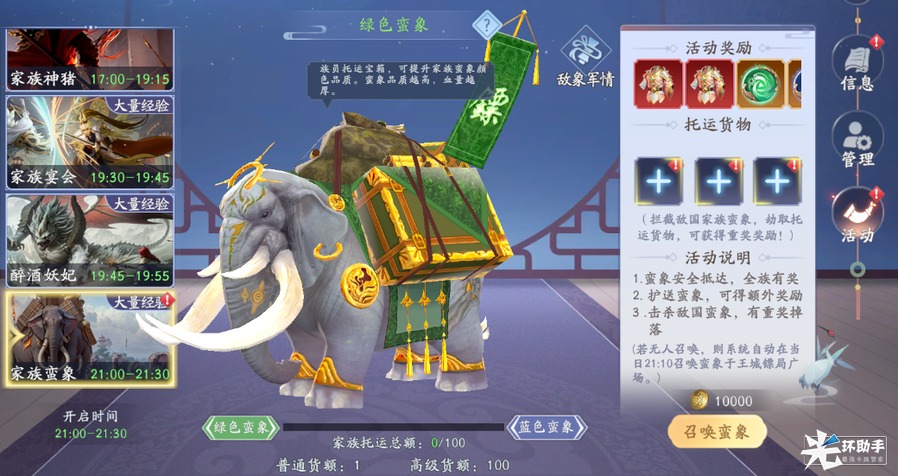 和神猪一样,召唤大象也是要消耗家族资金的,如果家族资金不够,就只能等系统自动召。