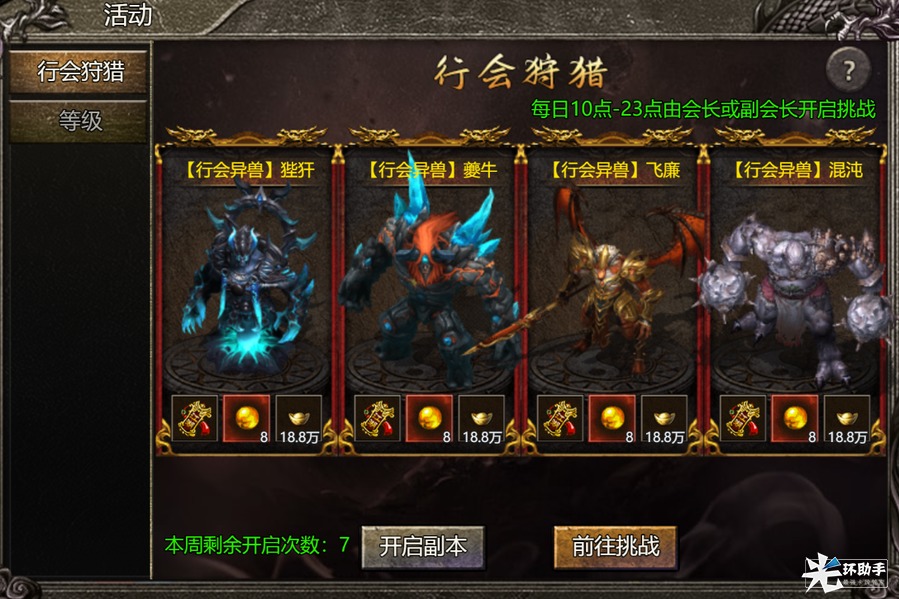 在活动页面,每日10点-23点由会长或副会长开启行会狩猎挑战,来获取江湖令来提升行会荣耀等级