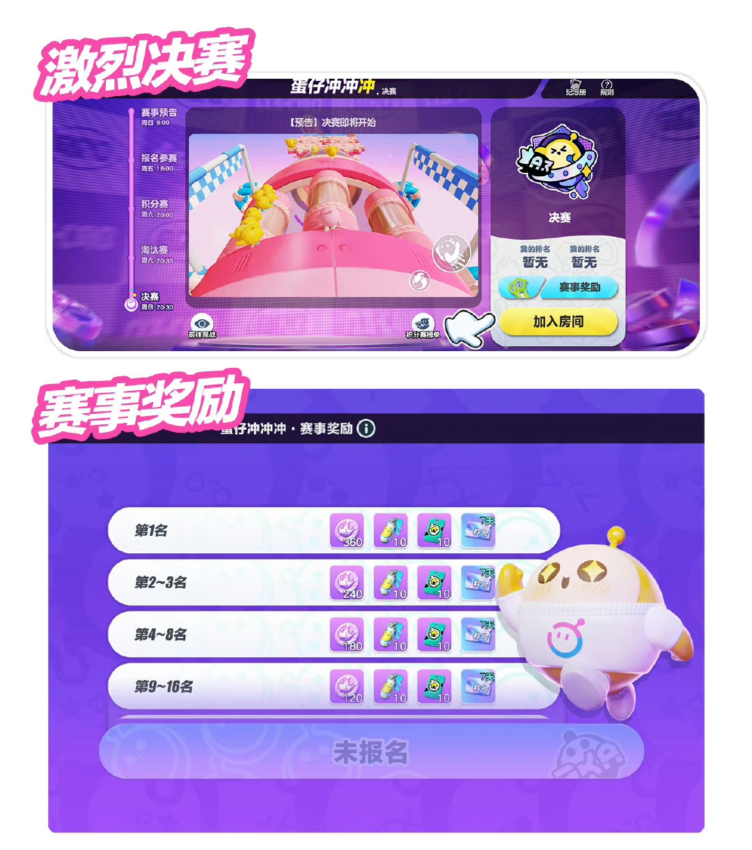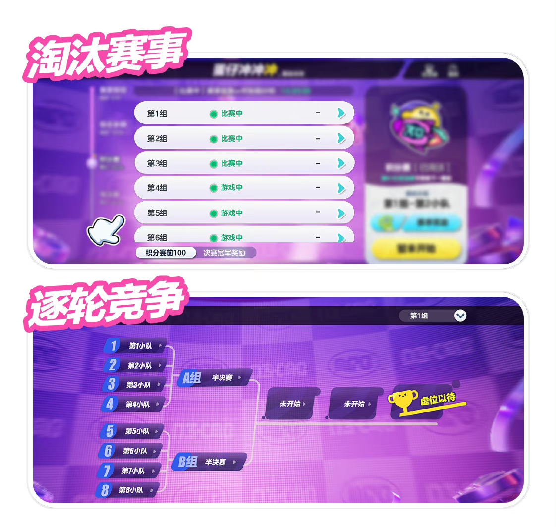 每周六20:35,淘汰赛将拉开帷幕!淘汰赛将分为四轮进行,前三轮比赛中获前八名的蛋仔将逐轮晋级,并在第四轮的淘汰赛决战关中争夺决赛资格!