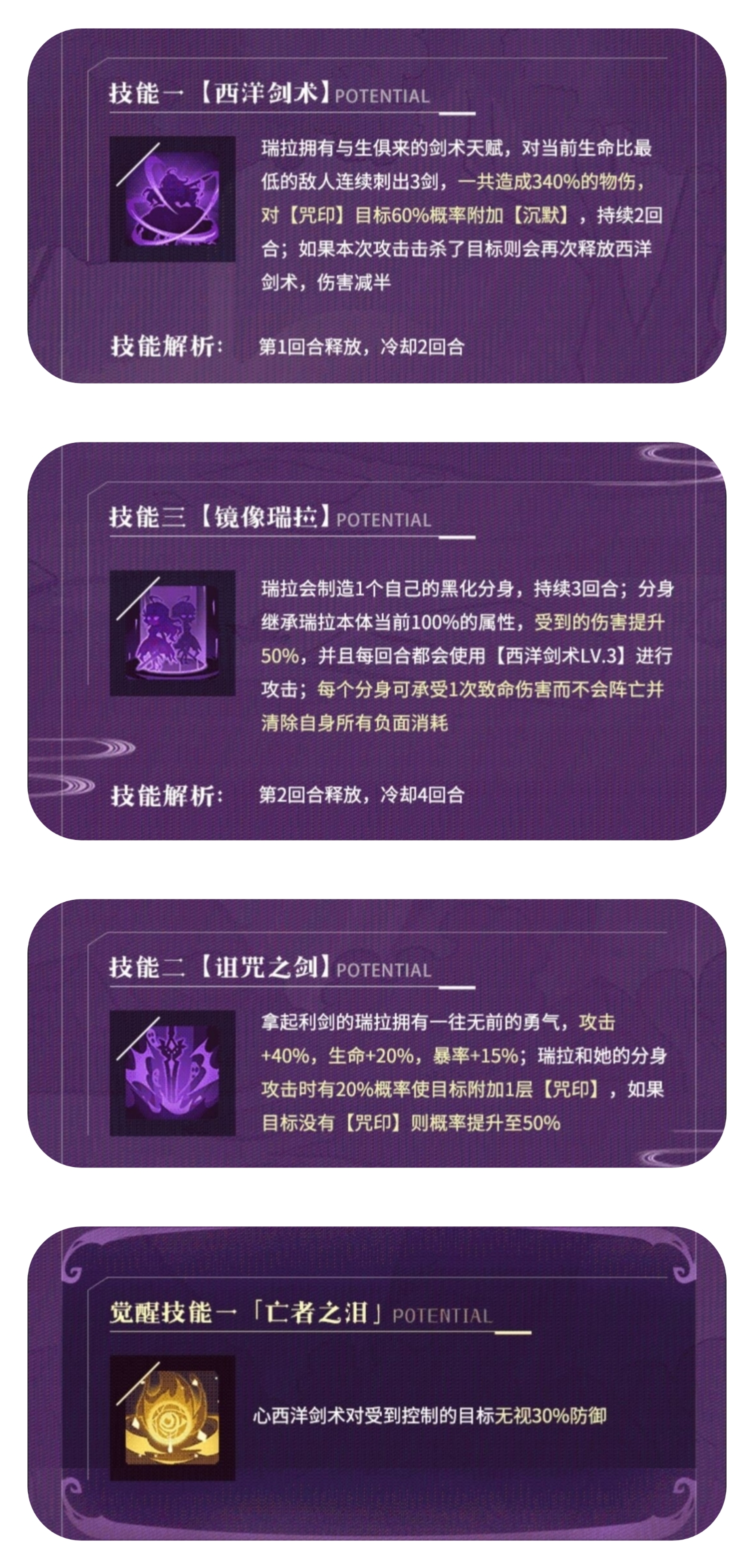 一个敌人的每层【刻印】会为瑞拉及分身提供增益,瑞拉每次攻击100%附加【刻印】,分身有45%附加【刻印】