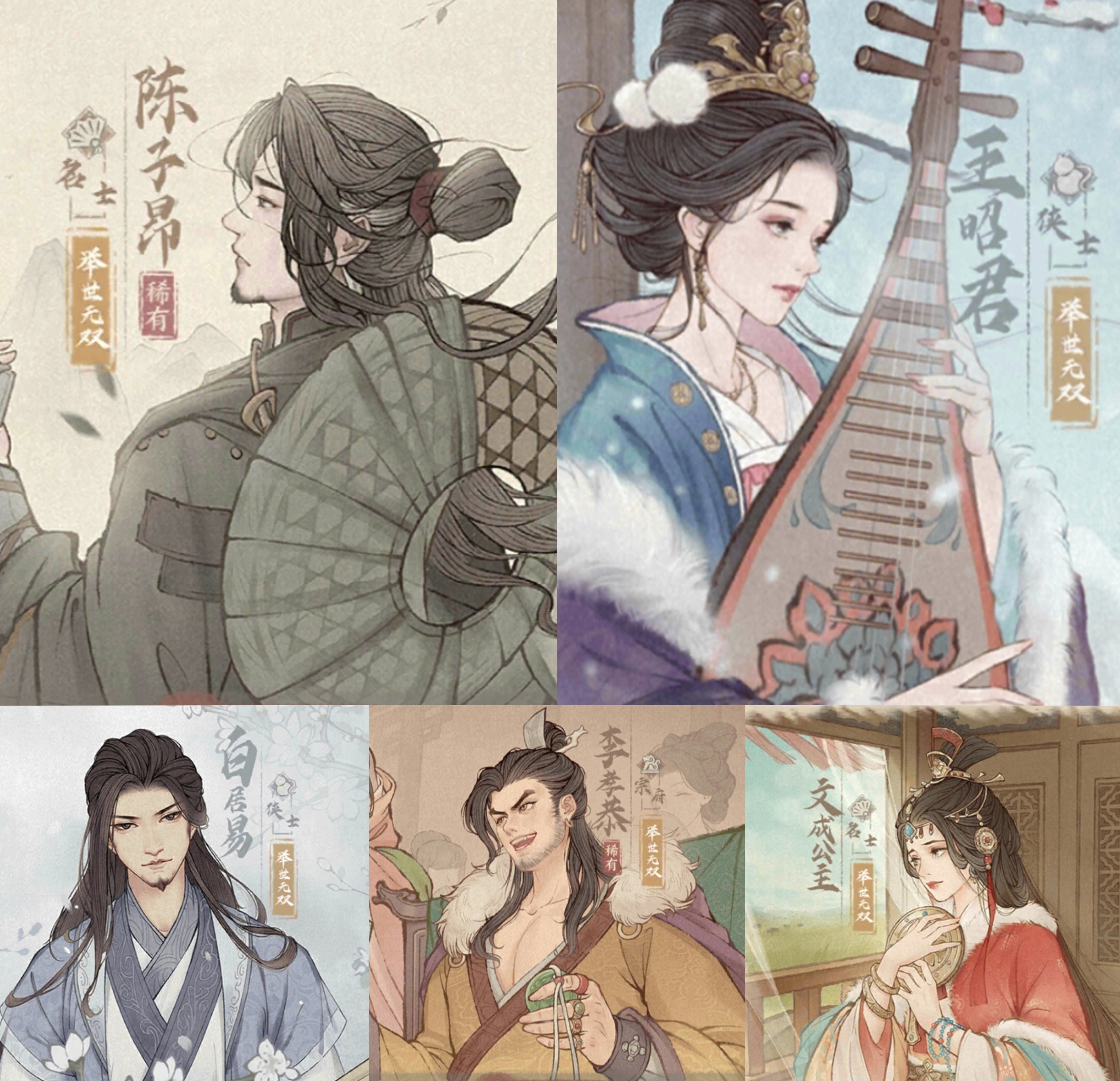 ①虬髯客+陈子昂(主c)+王昭君(副c)+白居易+文成公主(或换成梁红玉)。