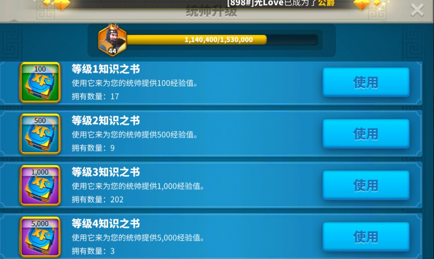 用全部经验书优先培养一个统帅。当你看到统帅50级以后每升一级都需要200多万经验时,你就会明白集中资源的重要性了。我们需要的是